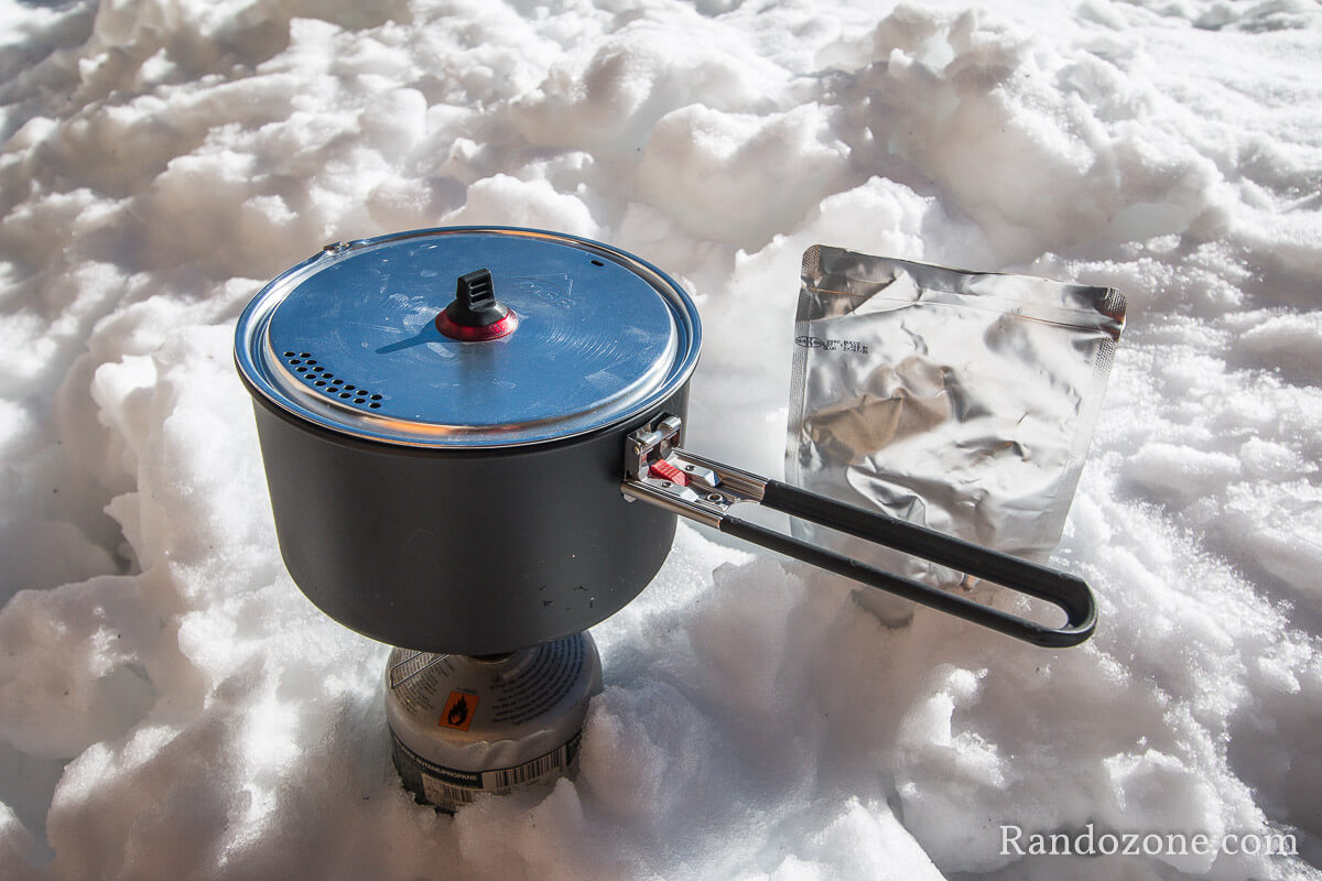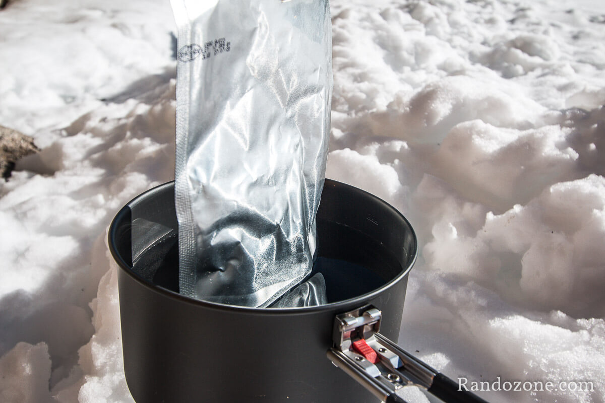 Le principe est d'essayer d'obtenir un plat savoureux avec un mininum de préparation. On met de l'eau dans une casserole, on place le sachet et on fait chauffer. C'est tout. C'est comme ça que j'ai procédé pour ce test lors d'un séjour dans les Cévennes (en début d'année 2018) après de grosses chutes de neige.
