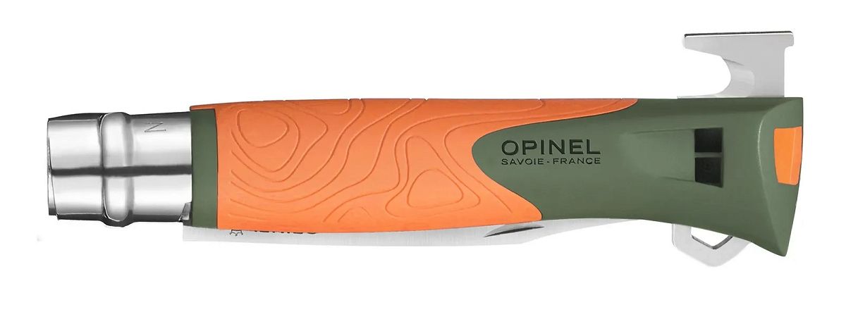 Courte et robuste, la lame de l’Opinel N°12 Explore est en acier inoxydable 12C27M. C’est une lame qui ne noircit pas mais qui a un très bon tranchant. Ce couteau ami du randonneur est également bien pensé car il intègre un sifflet de 110 dB permettant de se signaler et un crochet coupant pour le gibier.