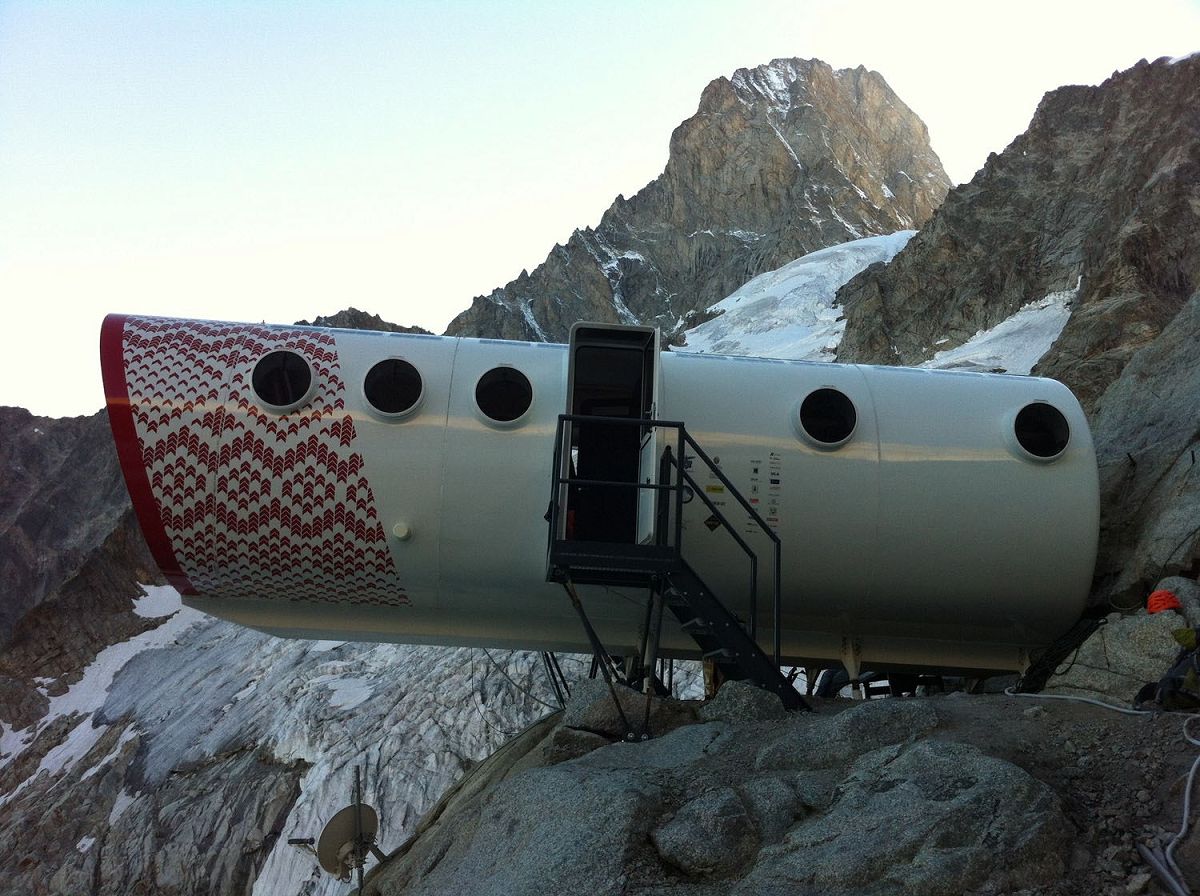Il s'agit plus exactement du premier module du futur bivouac du glacier de Fébrouze dans le Mont-Blanc. Plus de tôle,de béton, de bois avec des formes très carrées : le nouveau refuge est un cylindre blanc et rouge de 8 mètres de long, aux lignes épurées.