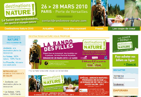 Toujours à l’avant-garde des tendances et des nouvelles attentes des Français, Destinations NATURE ! Le Salon des randonnées, des sports et voyages nature façonne sur mesure tous les rêves d’évasion et d’aventure du 26 au 28 mars 2010, Porte de Versailles, Pavillon 6… En solo, duo ou groupe !
