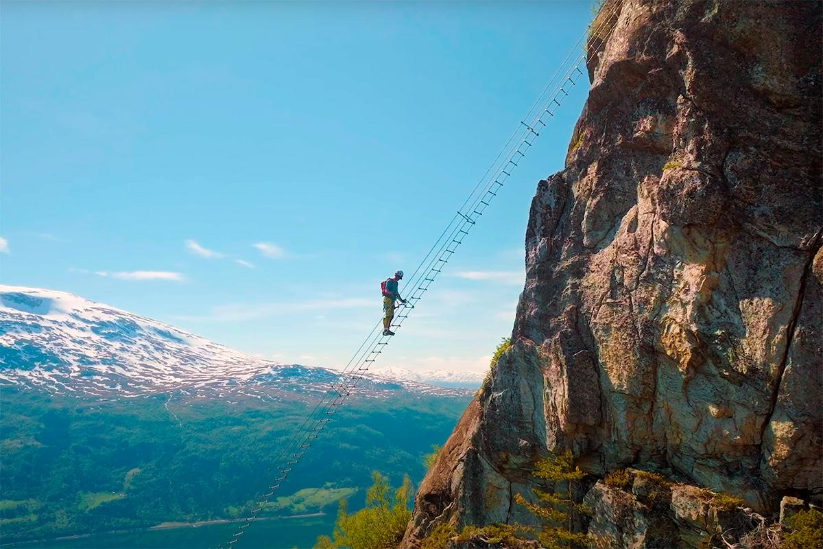 Une nouvelle attraction de plein air spectaculaire a été inaugurée au village de Loen, dans la région de Nordfjord au nord-ouest de la Norvège. Il s'agit d'une échelle suspendue baptisée "Stigull", d'une longueur de 40 mètres et 120 marches, inclinée à 45 degrés et flottant à plus de 750 mètres au-dessus du vide d'un fjord.