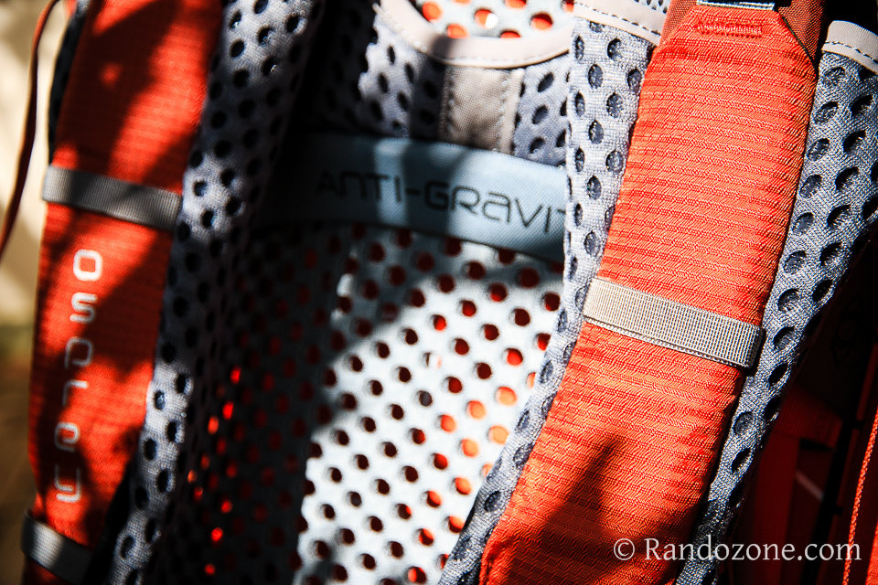 Un autre élément important pour un sac à dos, c'est justement qu'on porte le sac sur le dos. Et donc, il peut y avoir un contact entre le sac et le dos ce qui est souvent source de gène ou de transpiration excessive très désagréable. Ici, Osprey à pensé à notre dos et propose un système qui permet au sac d'être assez loin du dos. Ils ont aussi mis un filet d'aération. Résultat, pas de transpiration dans le dos, juste un peu au niveau de la ceinture lombaire mais elle est tellement agréable qu'on lui pardonne facilement.