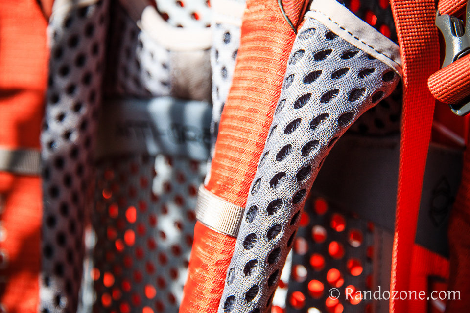 Le dos très aéré est composé d'un tissu maillé et les épaisses bretelles sont aussi équipées de ce tissus.