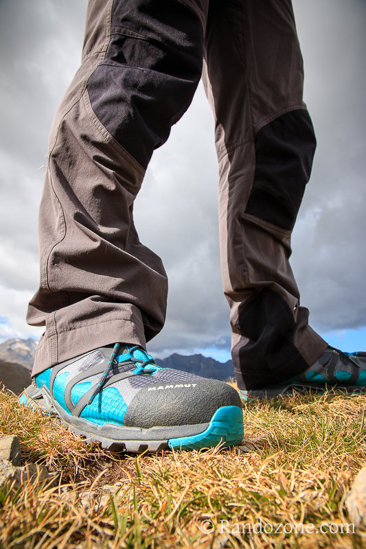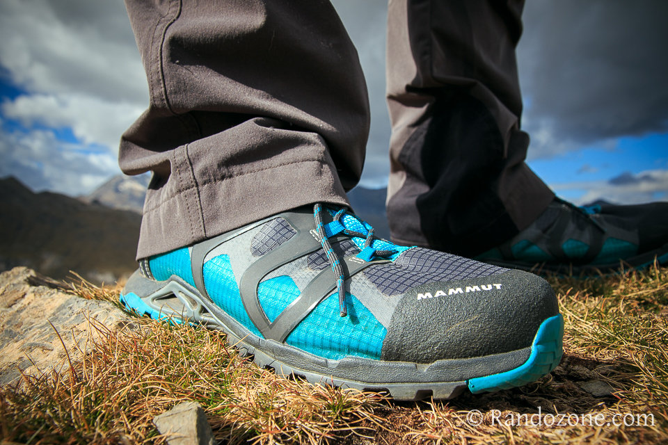 Des chaussures à tige basse de la marque Mammut prévues pour le fast hiking et même pour courir un peu en montagne.