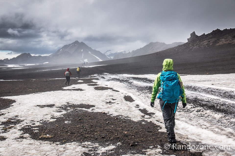 En ce premier jour du mois de juillet, il ne fait pas très chaud. Nous sommes sur le trek du Laugavegur en Islande. Le temps est maussage...