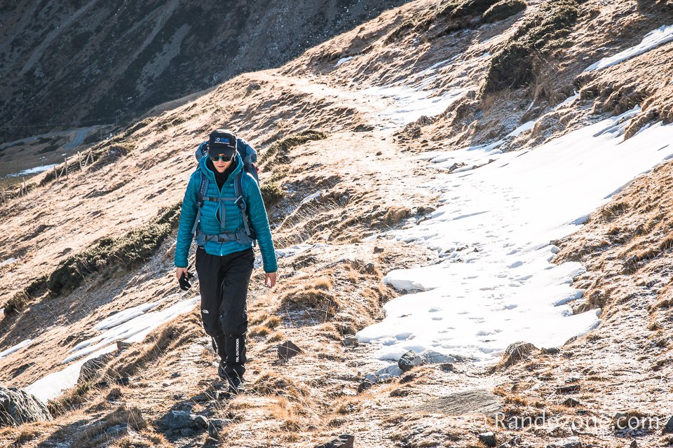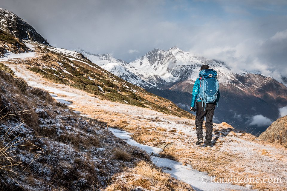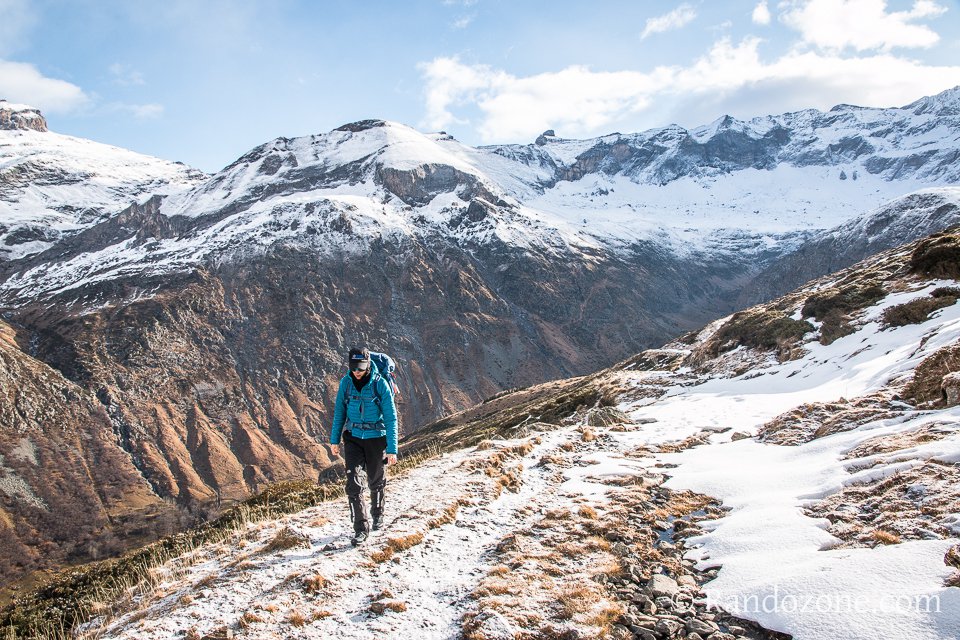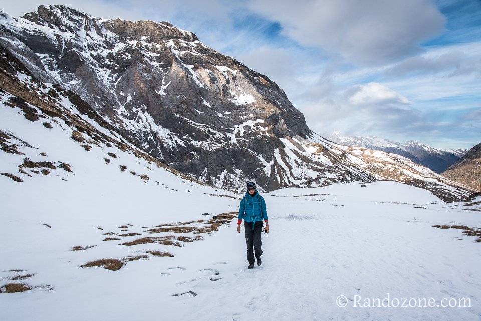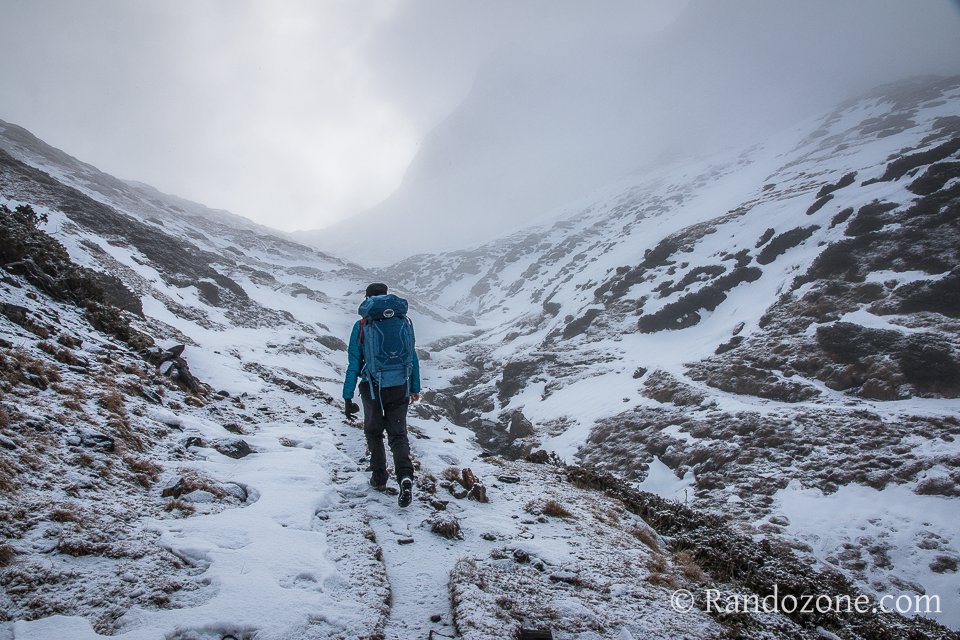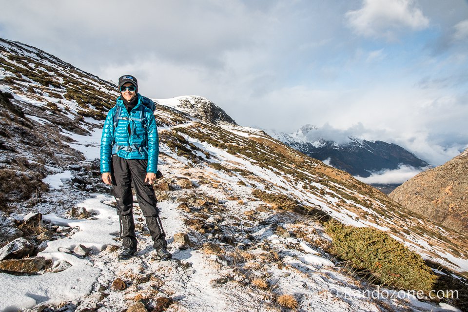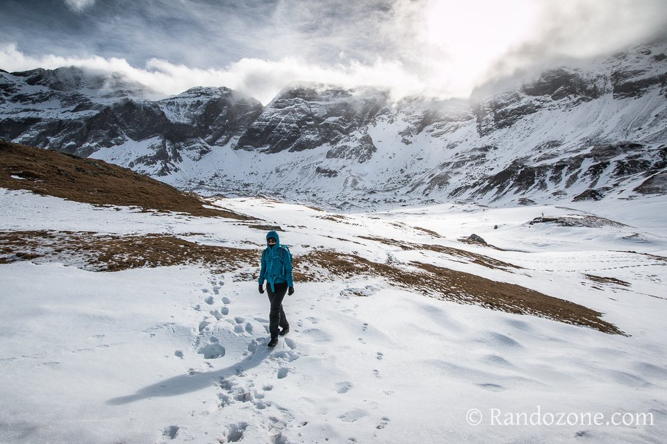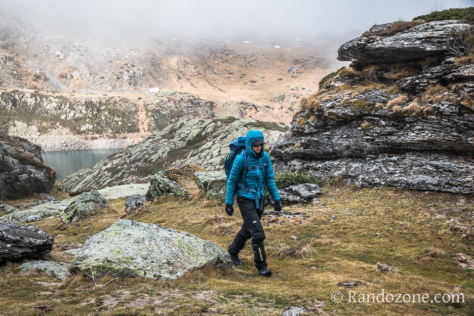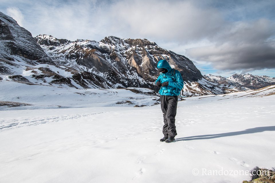 Une autre randonnée dans des conditions difficiles : froid (0 degrés au départ), neige et grésil, brouillard. De très bonnes conditions pour tester cette doudoune Quechua X-Light qui s'en est très bien tirée.