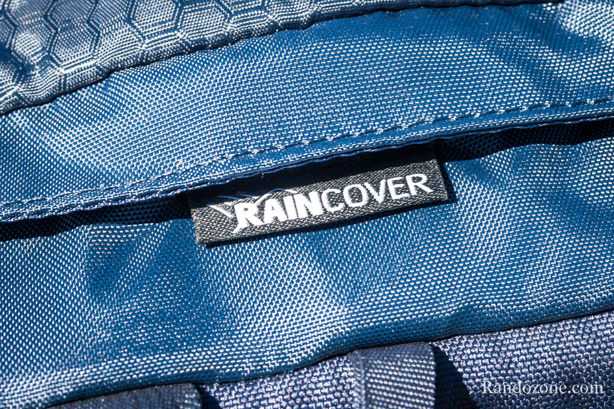 Une cape de pluie est rangée dans la poche du dessus et on peut l'attacher avec une sangle pour ne pas la perdre. Bien pensé.