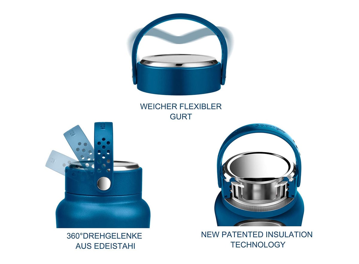 - Conserve le chaud et le froid grâce à la paroie double : liquides froids pendant 24 heures ou chauds pendant 12 heures.