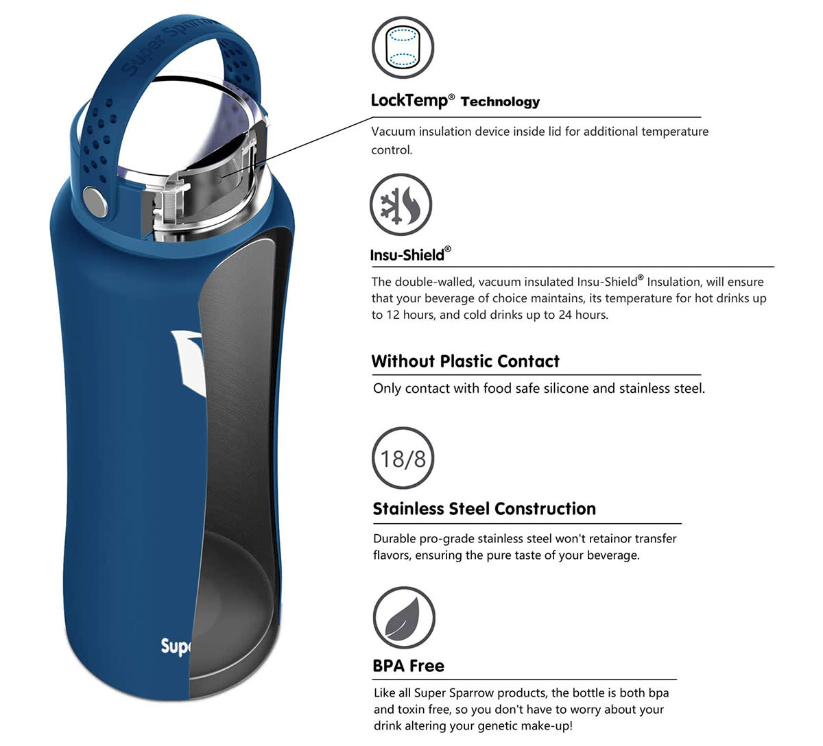 La gourde isotherme de la marque Super Sparrow avec ouverture classique. Les bouteilles sont fabriquées en plastique non toxique sans BPA.
