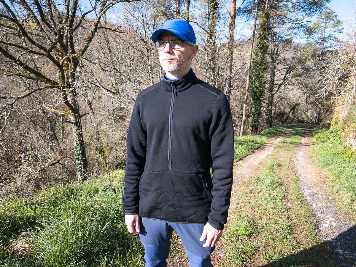 La coupe est volontairement décontractée et ample, ce qui permet de superposer facilement des vêtements en dessous. Personnellement, je conseille de porter un t-shirt technique manches longues en laine mérinos 260 ou 320 g/m² en dessous. On reste alors entièrement en fibres naturelles, et les propriétés autorégulantes et anti-odeur de la laine mérinos opèrent pleinement.
