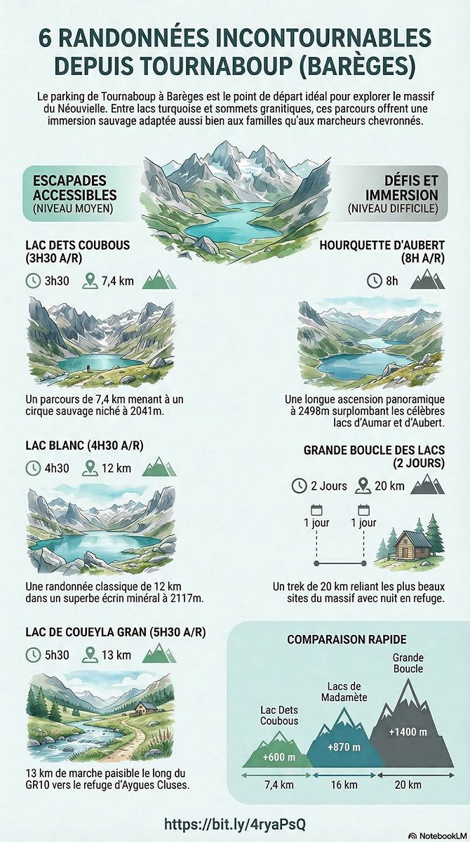 Depuis le parking de Tournaboup à Barèges, six superbes randonnées révèlent la diversité et la splendeur du massif du Néouvielle. De la balade familiale vers le lac Dets Coubous à la grande boucle des lacs sur deux jours pour les plus aguerris, chaque itinéraire invite à explorer une nature préservée, de forêts en estives, de lacs glaciaires en sommets panoramiques.
