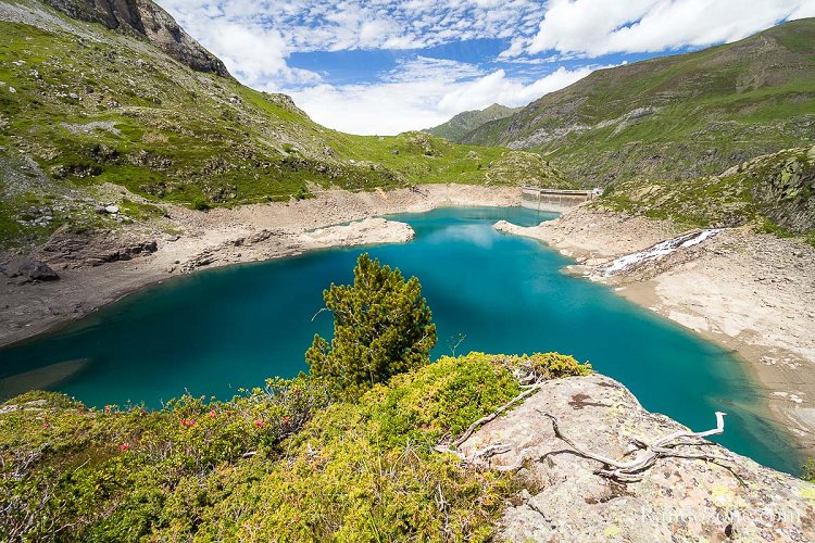 Nous continuons ensuite à suivre le sentier et parvenons au lac que nous avons longé le matin. On le coutourne en prenant le sentier sur la droite ce qui fait que nous ne repassons pas par le même sentier. Ce sentier nous permet de dominer le lac et d'avoir une belle vue sur le barrage.
