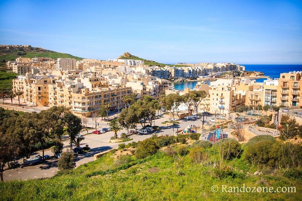 Nous nous éloignons des falaises et arrivons après un petit moment au-dessus de Ramla Bay. La vue sur la baie est très belle : il y a la plage de sable, une statue blanche que l'on distingue et cette eau si merveilleusement bleu transparente. Nous suivons les marches incertaines qui mènent à la plage et nous la découvrons mieux. Nous passons là un petit moment à profiter de la douceur du lieu.