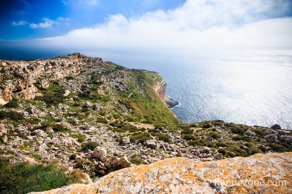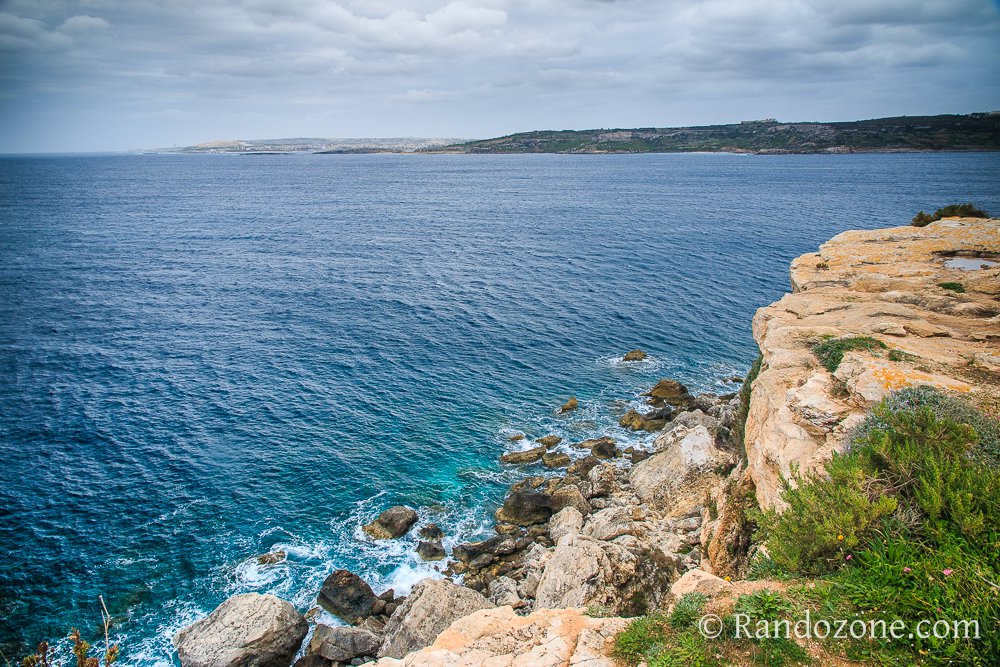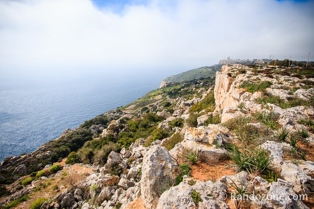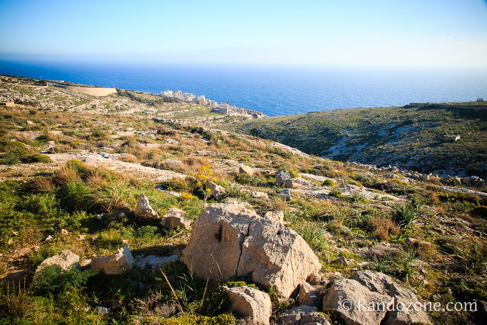Un petit îlot attire notre attention, il s'agit de Filfla. Il y a aussi des champs bien verts, et des fleurs jaunes partout, le printemps a bien de l'avance à Malte comparé à chez nous. Nous prenons sur la droite un chemin caillouteux et nos pas nous mènent au bout du promontoire. Nous apprenons que nous sommes dans un ancien village, datant de l'âge de bronze : Il Wardija ta' san gorg. Le site est superbe et la vue sur les falaises vaut à elle seule le déplacement. En contrebas, on peut découvrir le chemin que nous allons suivre, et toujours la mer, superbe dans ce paysage coloré.