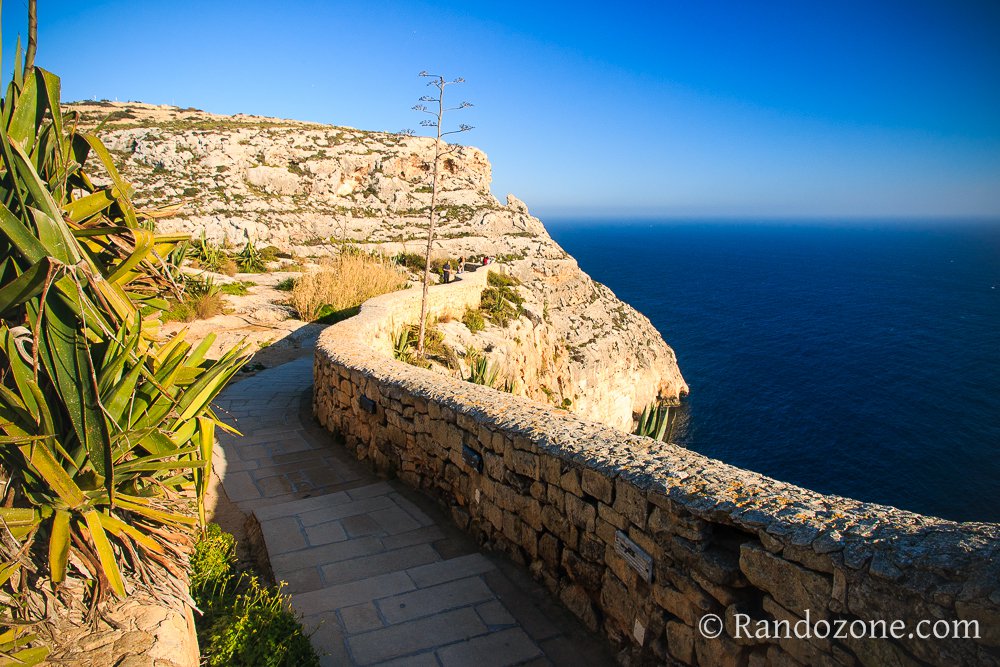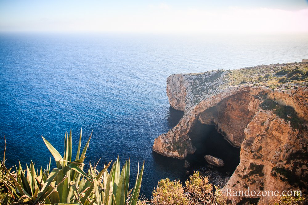 Nous reprenons notre chemin pour arriver moins de 10 minutes plus tard au lieu dont on nous a parlé. De là où nous sommes, nous dominons la mer. Juste en dessous de nous se trouvent des plantes exotiques et divers cactus. En tournant légèrement les yeux, nous découvrons Wied-iz-Zurrieq. Il y a des excursions en bateau qui permettent depuis la crique de visiter la grotte bleue, connue pour son arche naturelle, ses eaux cristallines et ses cavernes. Le spectacle est vraiment très beau, quel dommage que nous ne restions pas plus longtemps à Malte, histoire d'aller découvrir ces merveilles qui sont à portée de main.