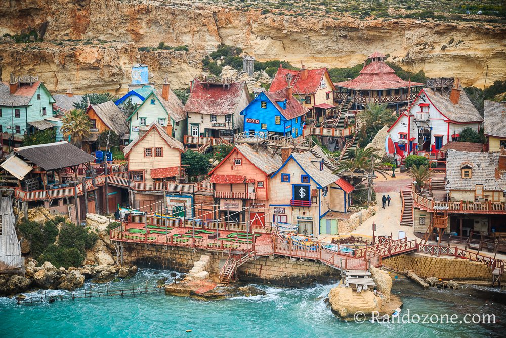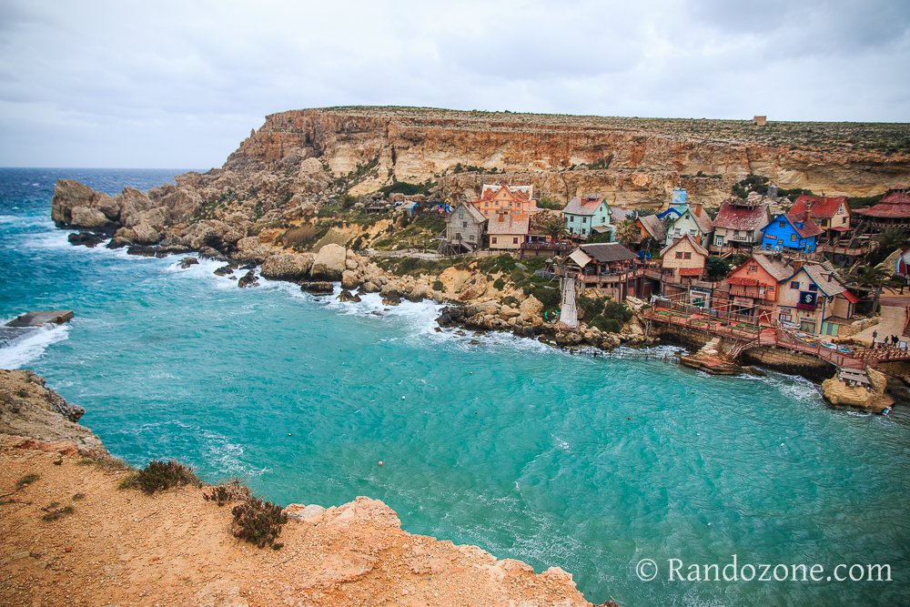 Puis, comme le temps nous manquait, nous avons pris la voiture pour nous rendre sur les lieux que nous aurions du voir le matin, lors de notre randonnée. Nous voici au bord des falaises, le vent souffle fort, et une jolie chapelle se trouve là, surplombant le rivage : la Chapelle de l'Immaculé Conception. Notre guide nous apprend qu'un jour de tempête, deux amis sont sortis en mer, mais un seul est rentré, alors en sa mémoire il a érigé ce monument. Puis, nous avons été découvrir le village de Popeye, à Mellieha. L'endroit a servi de décor cinématographique en 1979 et se trouve niché dans une jolie baie.