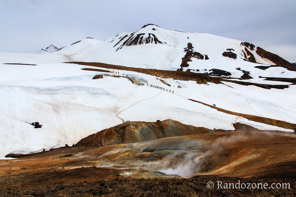 Puis, vient la neige : cette année est exceptionnelle, il y en a vraiment beaucoup nous apprend notre guide. On marche pendant un long moment dans la neige avant d'arriver au refuge de Hrafntinnusker. Nous ne sommes qu'à la moitié de la journée.