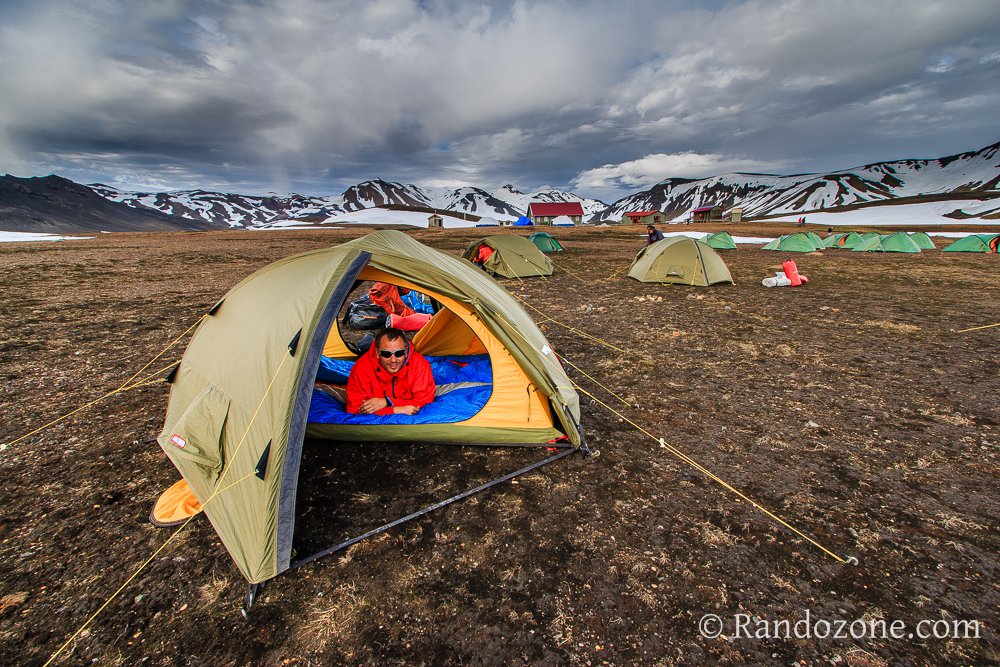 Un bon petit café sous la tente cuisine où nous rencontrons nos 8 compagnons de trek, puis nous montons nos tentes respectives. Afin de nous mettre en jambes et nous préparer mentalement à ce qui nous attend les trois prochains jours, Alli, notre guide, nous propose de le suivre pour une jolie petite randonnée : Bláhnúkur, aussi appelé le Pic Bleu.