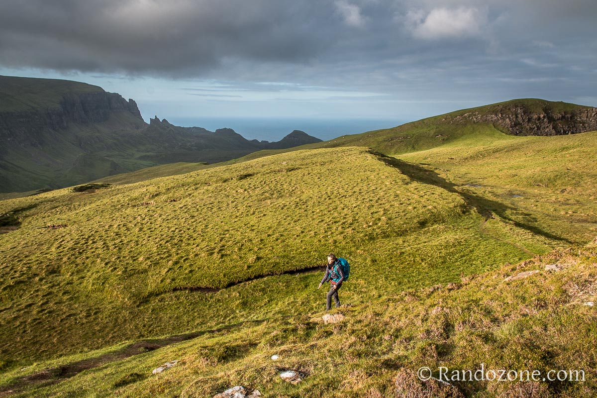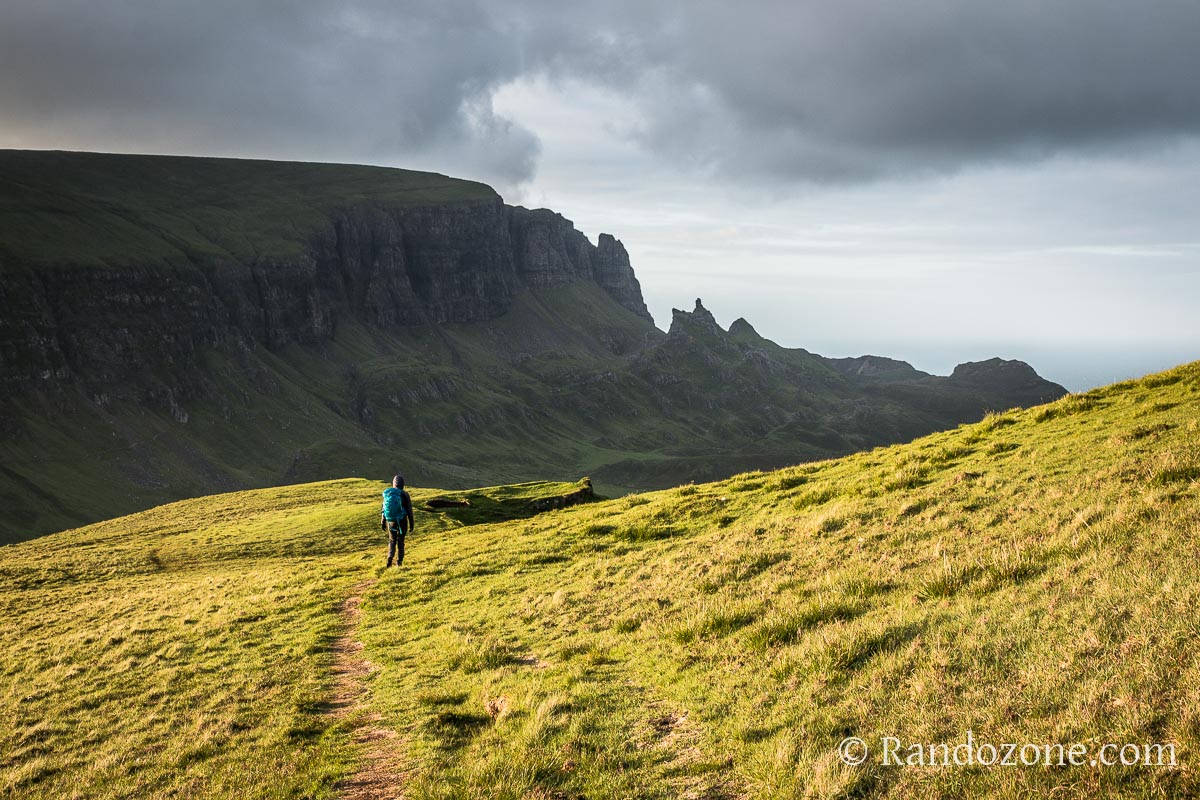 Quand on regarde vers Staffin il faut prendre le sentier qui part sur la droite. Le sentier de gauche sera pour plus tard, il s'agit de la randonnée de Quiraing, une des plus belles randonnées qu'on peut faire sur l'île de Skye. Comme nous venons d'arriver et qu'il est tard, on se contente d'une balade assez courte pour le premier jour.