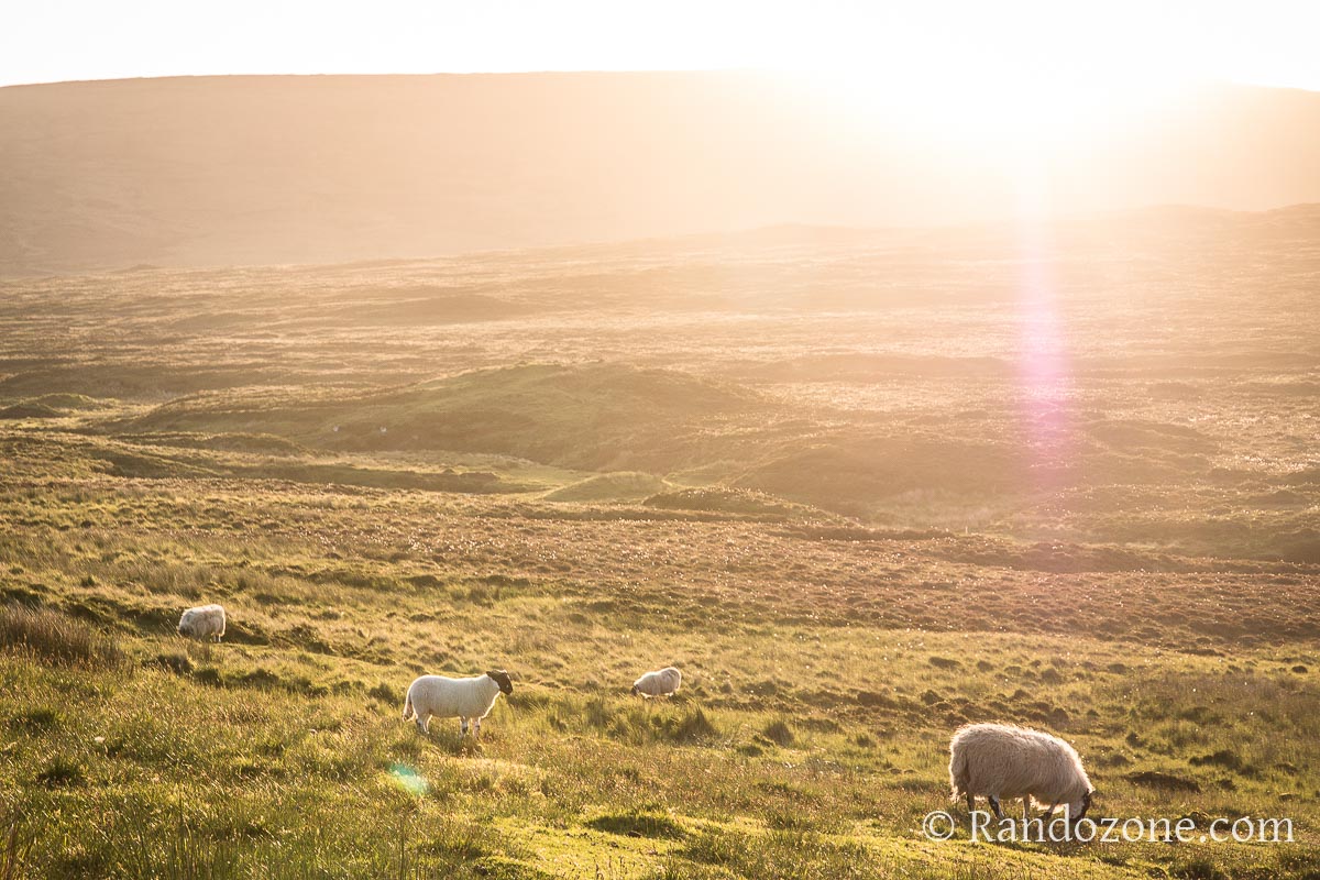 Encore un peu de marche et nous arrivons à Bioda Buidhe et nous coninuons un peu pour avoir une superbe vue sur le plateau et quelques moutons qui se trouvet là. La vue est splendide avec ces couleurs oranges du soleil qui se couche derrière nous.
