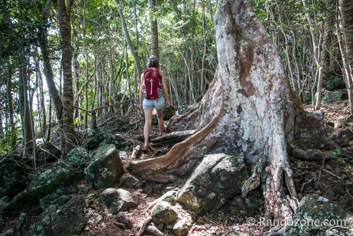 Durant tout le parcours nous sommes à l'ombre et c'est appréciable. La chaleur est pourtant étouffante et le taux d'humidité doit être vraiment très élevé. Heureusement, nous avons dans nos sacs à dos de quoi nous hydrater. Le sentier monte et descend, souvent régulièrement mais des fois plus fort. Les racines courent sur le sol, et les lianes s'enroulent de plus en plus haut le long des arbres. Des termitières ont été construites par leurs occupants par endroits. Ces grosses masses sombres sont impressionnantes ! On ne voudrait toutefois pour rien au monde avoir ça chez soi.