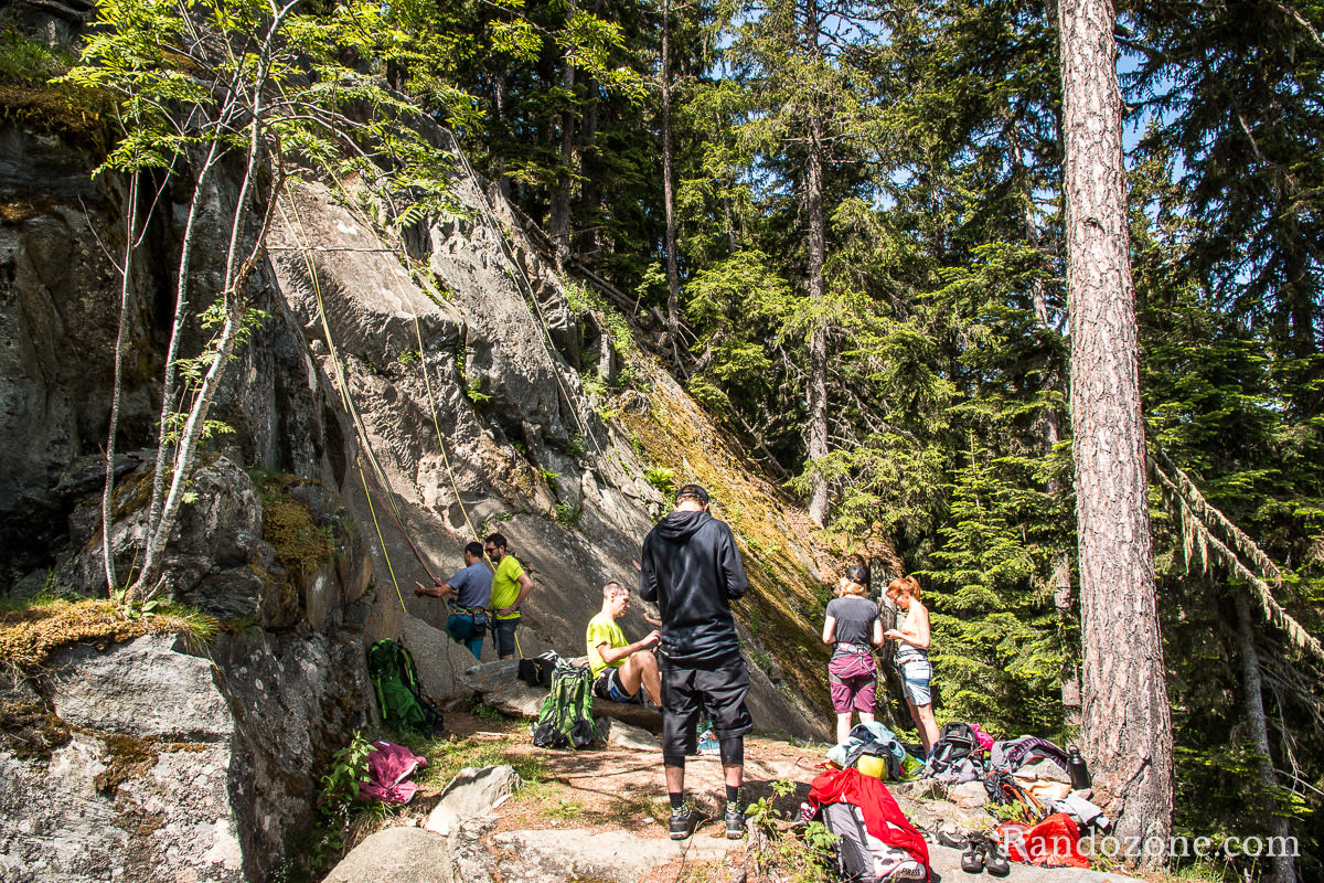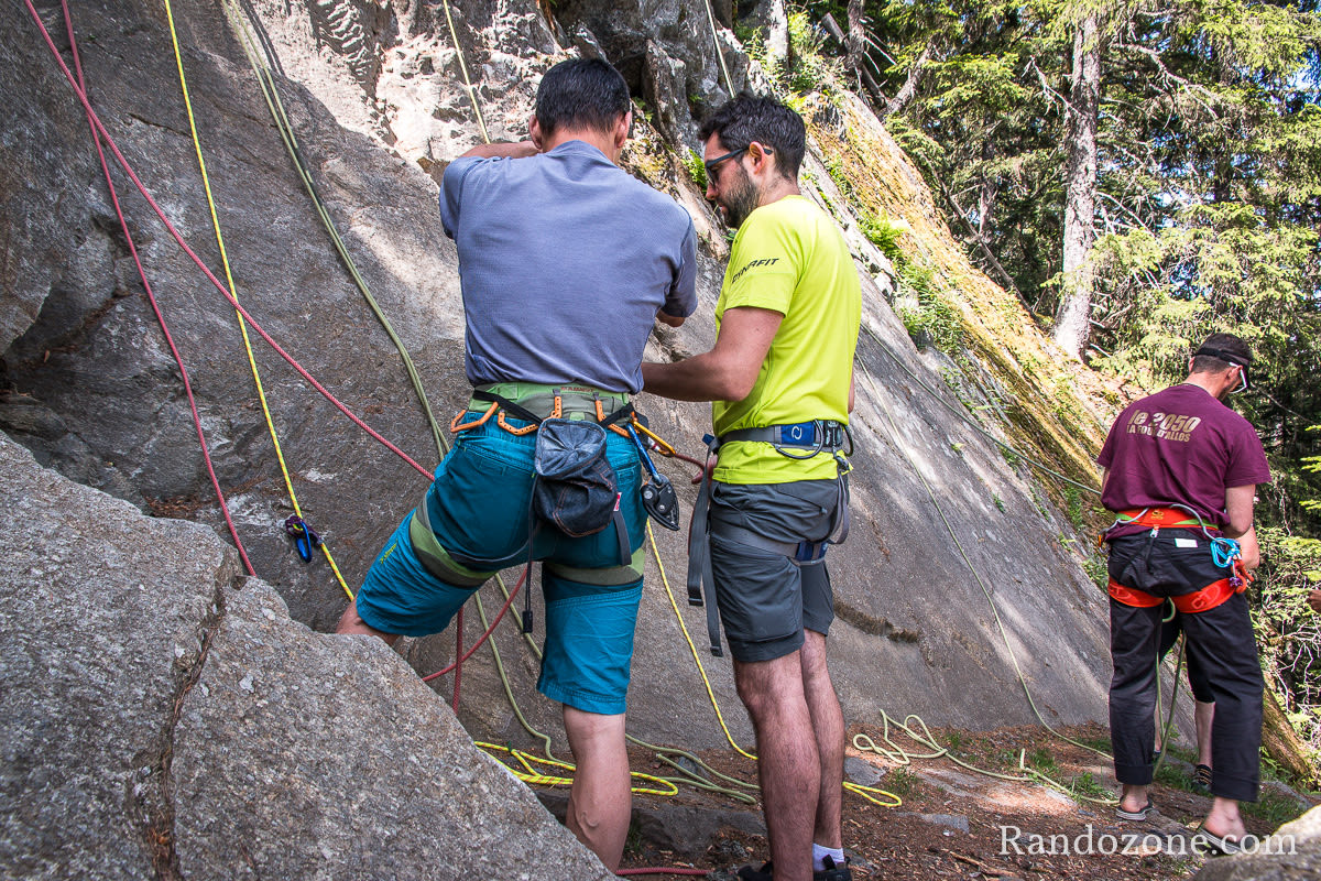 L'endroit est vraiment superbe. On domine la vallée et il n'y a que nous. Cédric Mister Good Guide installe rapidement les cordes et nous propose des chaussons et des baudriers pour qu'on s'équipe. Presque tout le monde a déjà fait de l'escalade donc on peut rapidement commencer à gravir la paroie. Je reste sur la section des débutants car je n'ai pas pratiqué depuis au moins 10 ans.