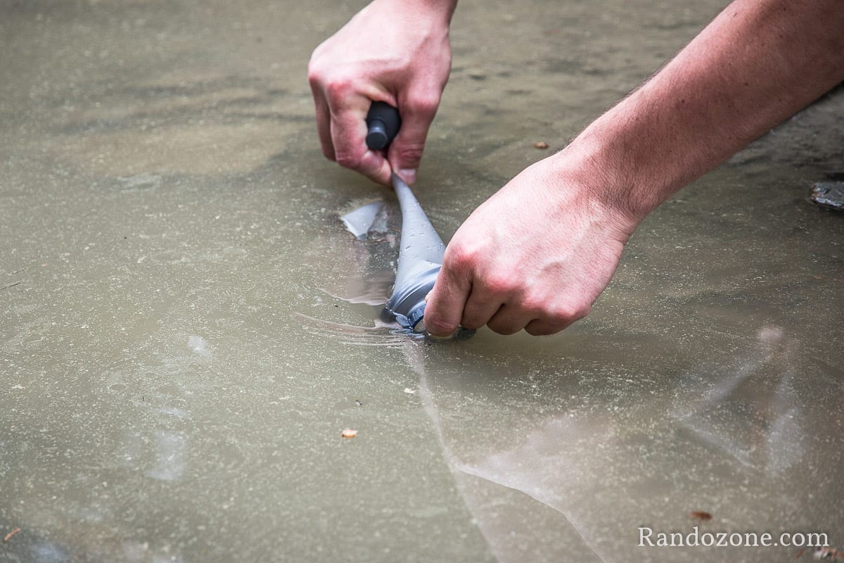 On profite de la présence d'une flaque sur une piste pour continuer à tester le filtre de Lifestraw. On récupère de l'eau dans la gourde souple Lifestraw Flex, on met en place le filtre et on est plusieurs à boire pour voir si l'eau est bien filtrée. Je n'ai pas été malade les jours suivants et l'eau n'avait pas de goût particulier...