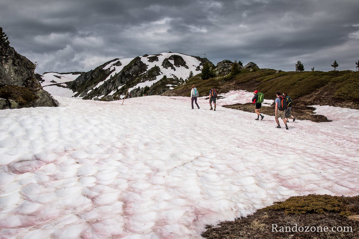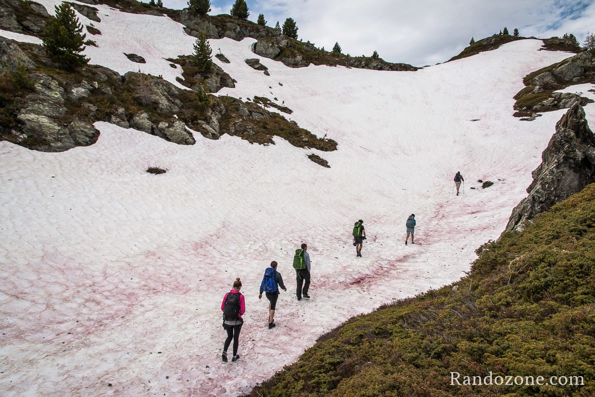 On décide de ne pas faire la randonnée qui était prévue mais de monter au col et de redescendre de l'autre côté. On reprend donc la marche dans la neige et on bascule sur l'autre versant qui s'avère aussi plein de neige. On commence donc de belle descente plus ou moins acrobatiques. La neige est molle et il n'y a aucun danger. On passe plusieurs névés puis on prend à flanc pour rejoindre (à travers les arbres et arbustes) une piste qui nous permet de revenir vers notre point de départ.