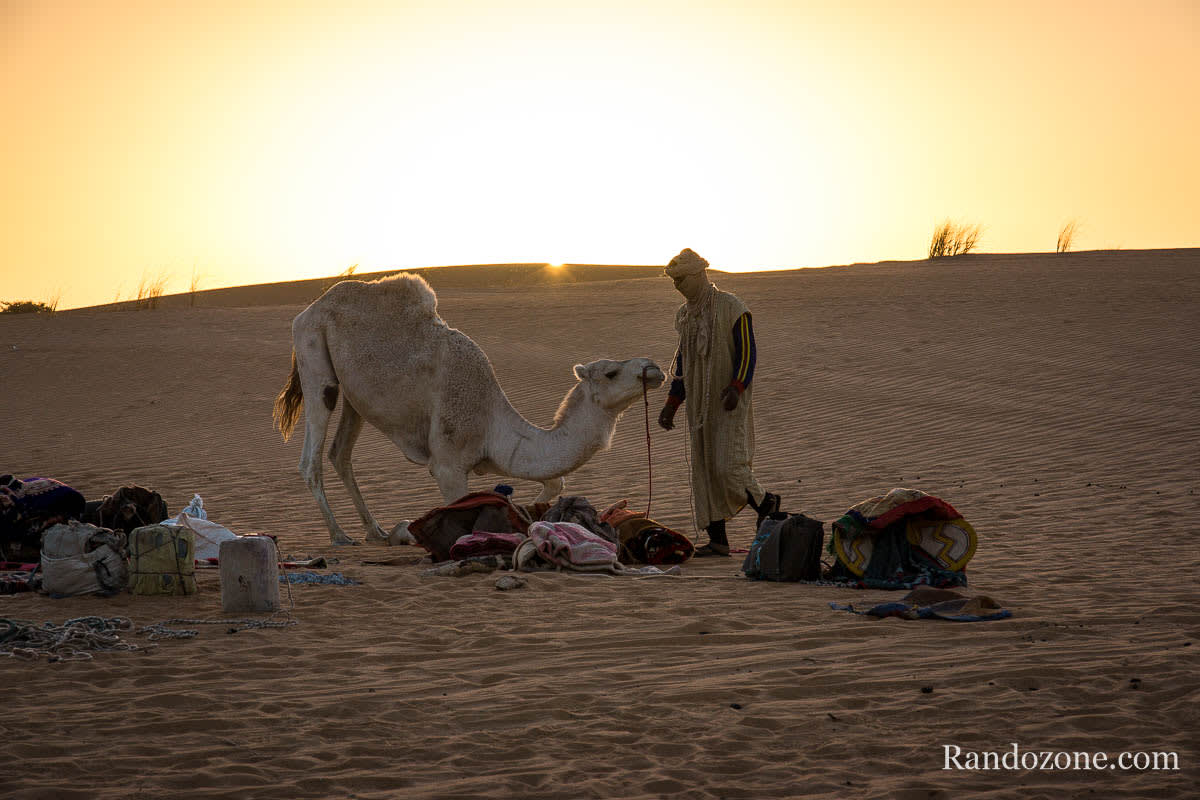 Pendant que nous dégustons des crêpes à la confiture, les chameliers chargent les montures avec nos affaires. Le jour se lève de plus en plus et voici enfin le lever de soleil sur notre lieu de bivouac. Quel douce et bienveillante lumière ! En une fraction de seconde elle nous réchauffe et nous quittons petit à petit nos doudounes.