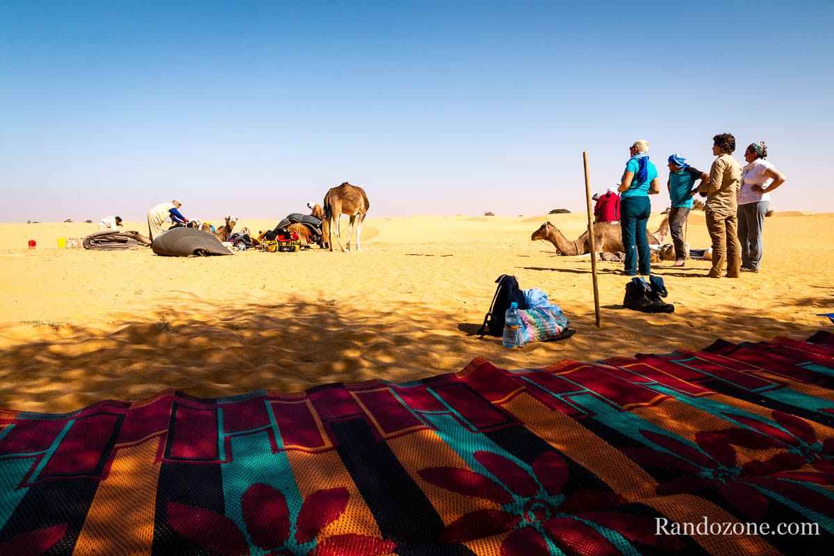 Après avoir rangé nos affaires, nous replions notre tente et la portons au campement. Salem et Sid Ahmed sont déjà en train de préparer notre petit déjeuner. Que c'est agréable de n'avoir rien d'autre à faire que de se laisser envouter par la magie du désert. Aussi loin que mon regard se porte, il y a des dunes de sable. Nous nous asseyons ensuite pour partager un moment de convivialité autour du petit déjeuner.