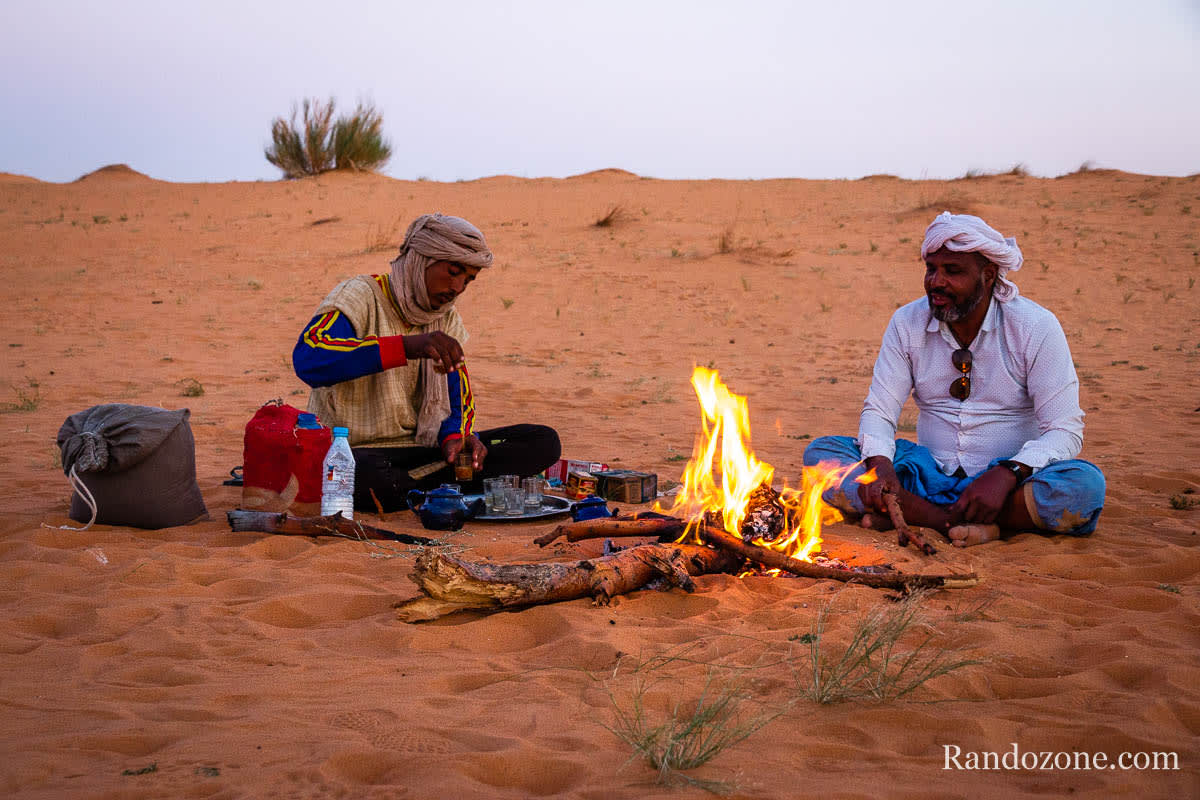 Ah, le thé, le fameux rituel des trois thés préparés par les nomades. Ici dans le désert on a le temps. Le temps de se plier à ce long rituel qui est également très agréable à regarder. Deux théières, des petits verres, un plateau en argent, des feuilles de thé et un feu allumé dans le sable. Qu'il est apaisant et intéressant de voir notre guide préparer ce chaud breuvage.