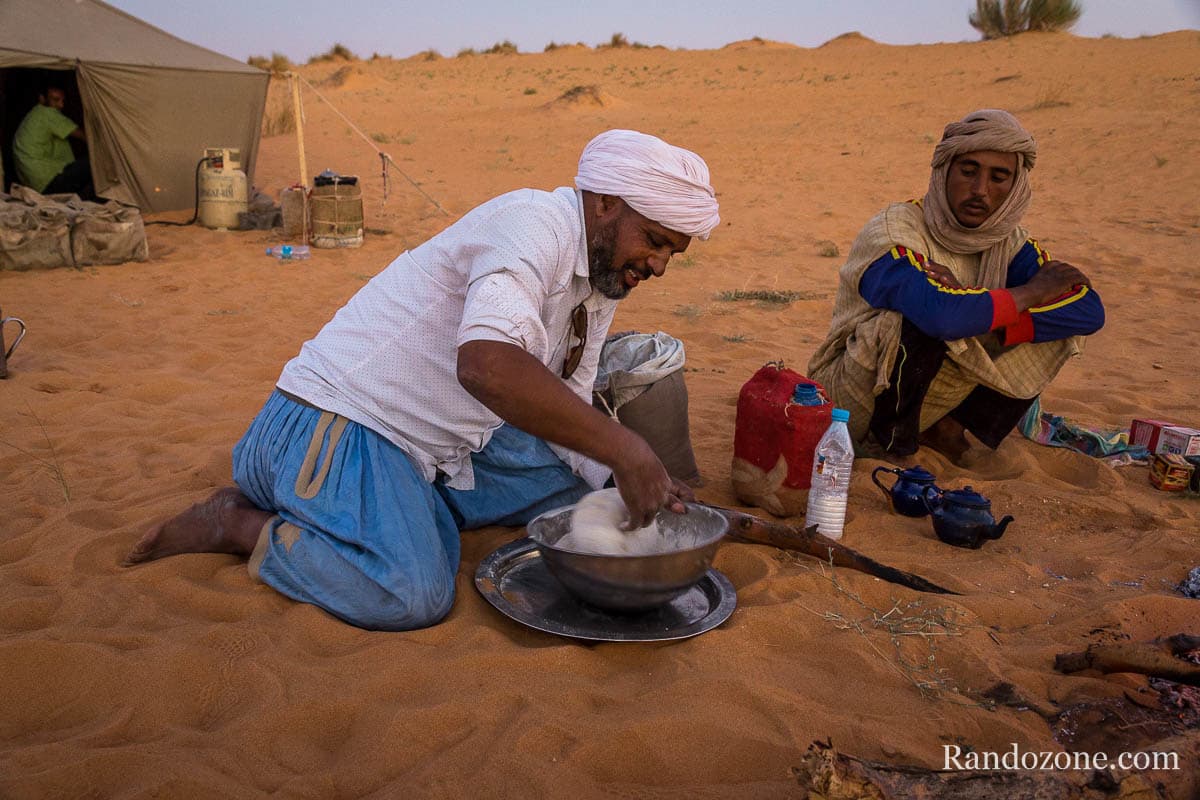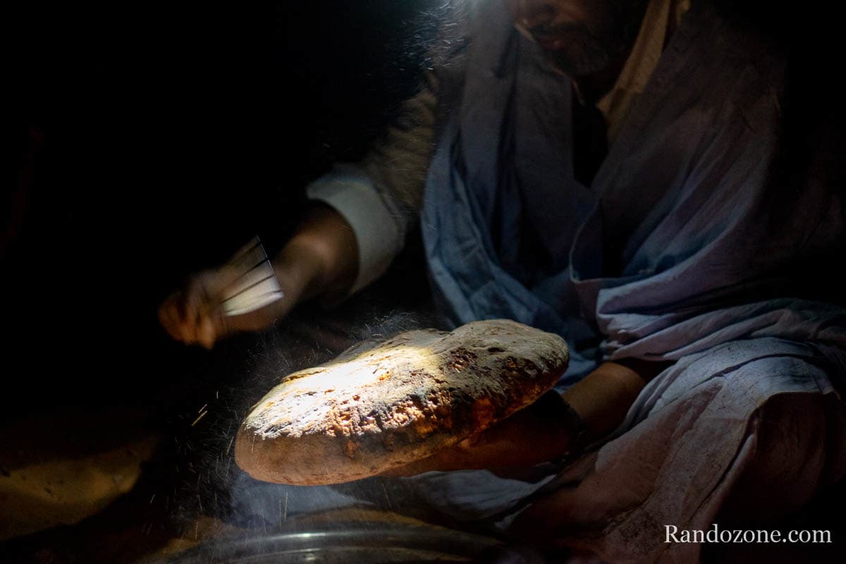 Dans le couchant j'aperçois des chameaux et des nomades au loin. Pendant que le feu de camps crépite, Salem pétrit de la pâte à pain. Après avoir préparé de belles braises, notre guide les écarte et creuse dans le sable puis dépose sa préparation. Il la recouvre ensuite de sable et de braises et laisse cuire un long moment.