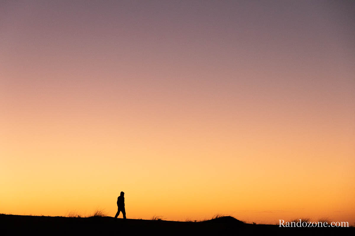 C'est notre dernière soirée dans le désert donc nous profitons du dernier coucher du soleil. Ces jours de marche auront passé rapidement et demain nous retrouverons la civiliation, les voitures et la douche... On serait bien restés encore quelques jours à marcher dans le désert...