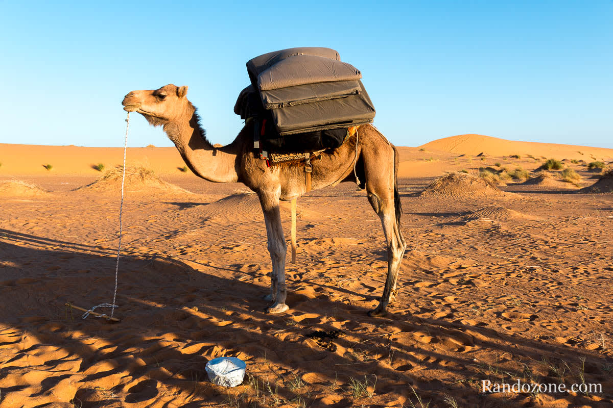 Comme chaque nuit, les dromadaires ont été se balader et un des chameliers doit aller les chercher pour les ramener au camp pour les charger. J'en profite pour faire des photos quand il revient avec ses bêtes.
