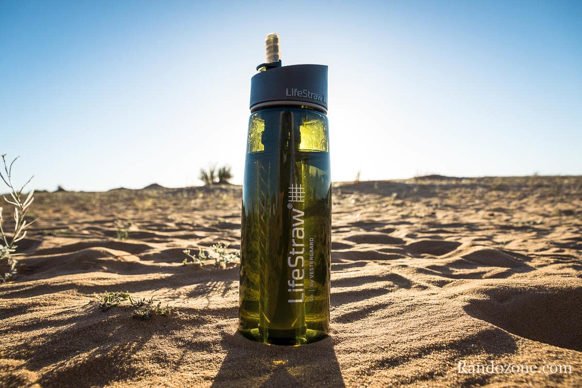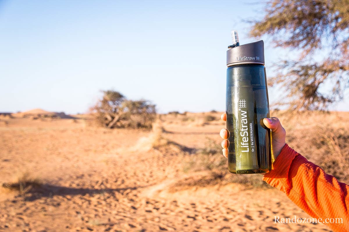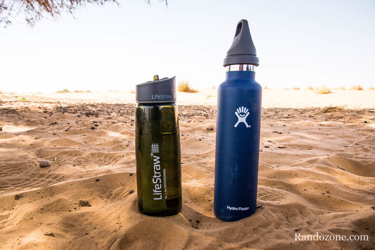 Comme tous les soirs, la veille, nous avons préparé nos bouteilles d'eau pour la journée. Il faut récupérer l'eau des bidons pour les mettre dans les gourdes. Ensuite, on met une pastille purifiante et il faut attendre au moins une heure pour pouvoir boire l'eau. En plus de ça, nous avons une gourde avec un double système de filtration. Ca permet de sécuriser l'eau encore plus et d'enlever un peu le goût qui donnent les pastilles.