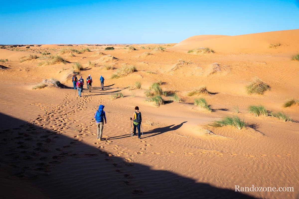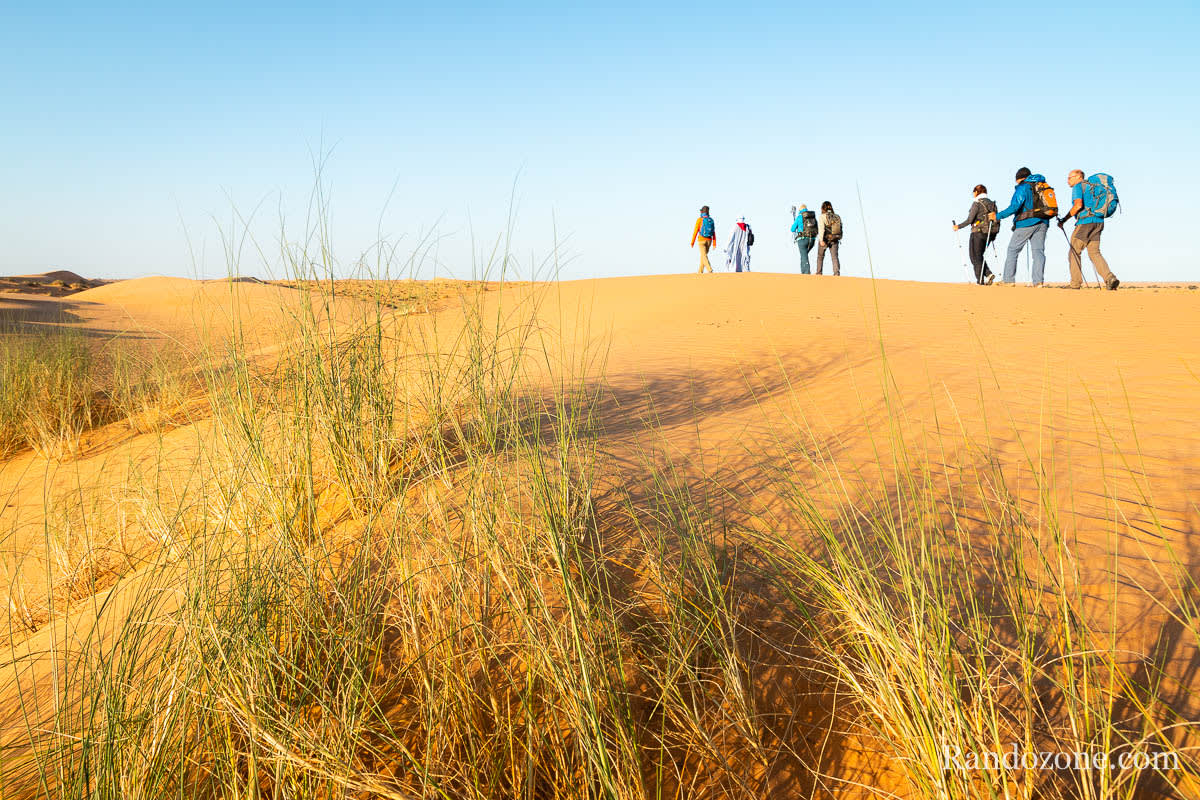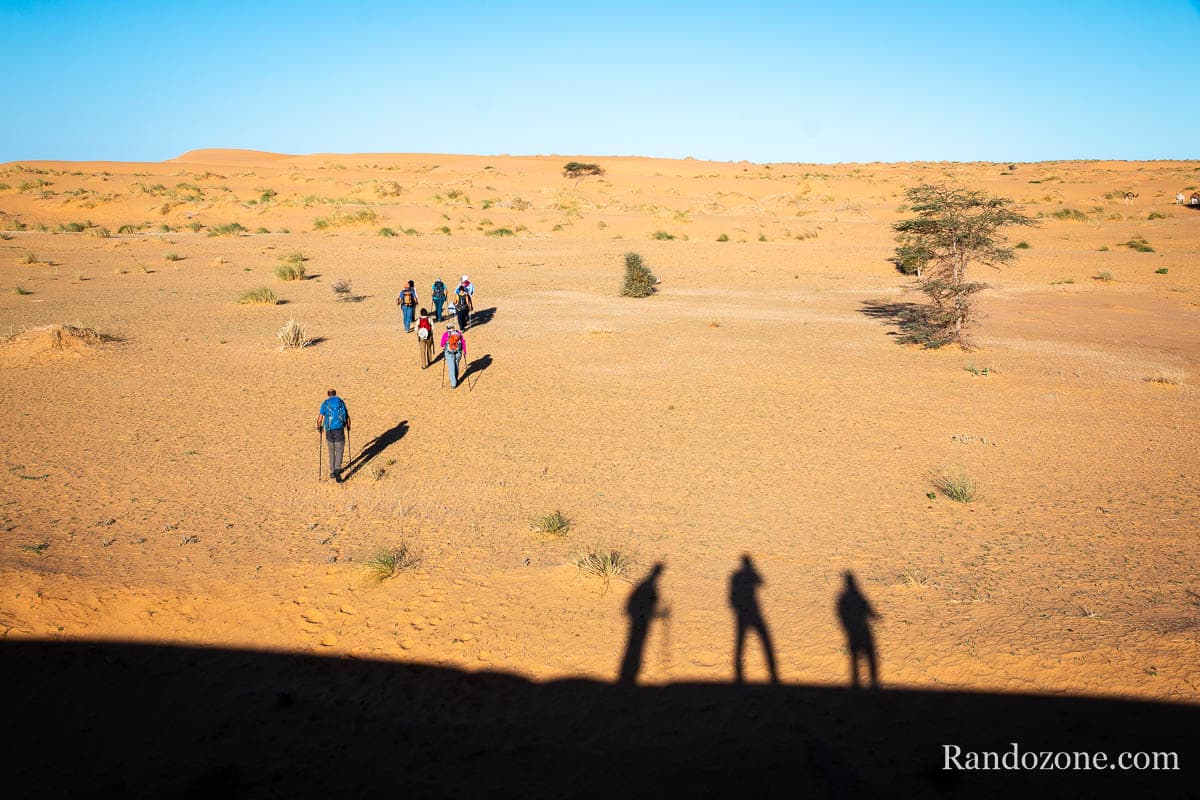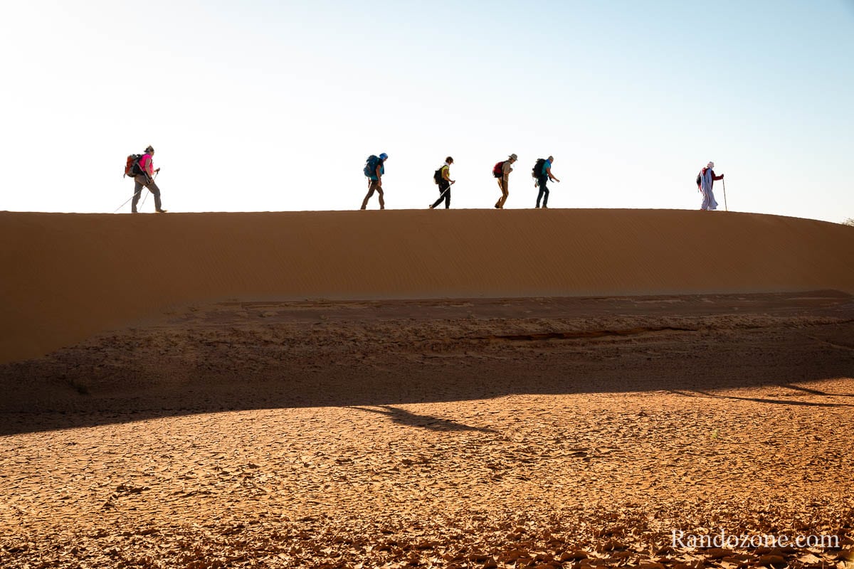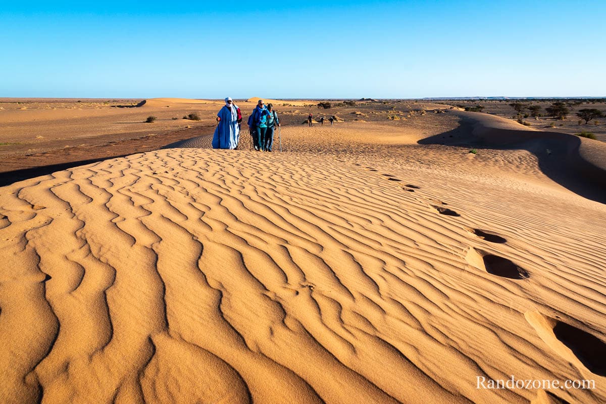 Nous sommes montés sur la dune pour prendre le lever du soleil en photo et le groupe nous rejoint avec Salem notre guide. Pas de vent, un ciel tout bleu et une lumière superbe. La marche peut commencer.