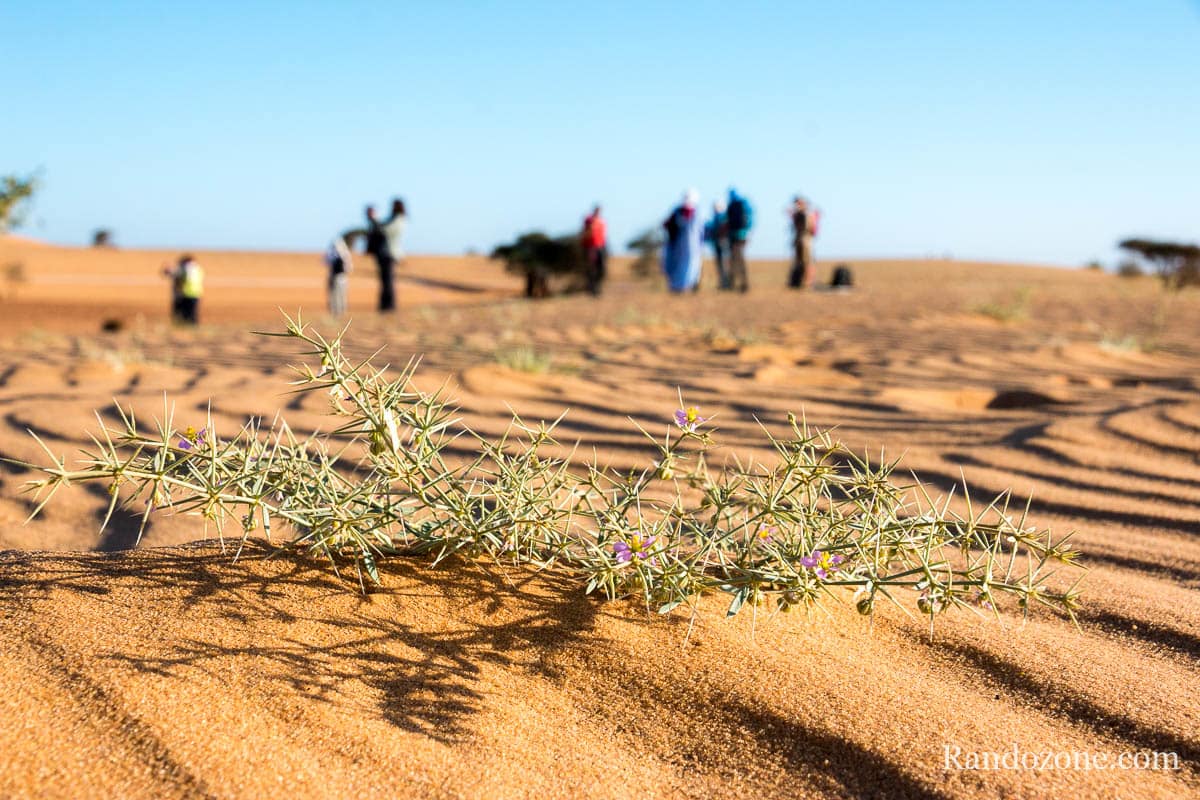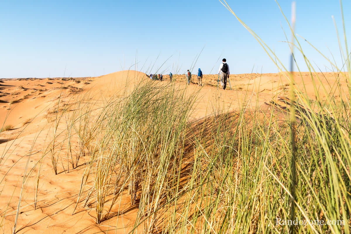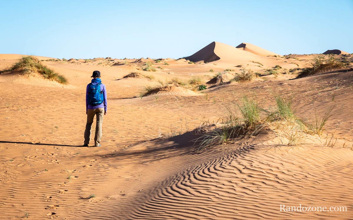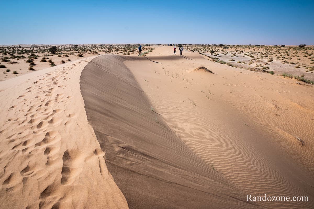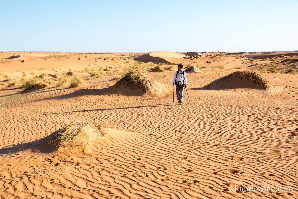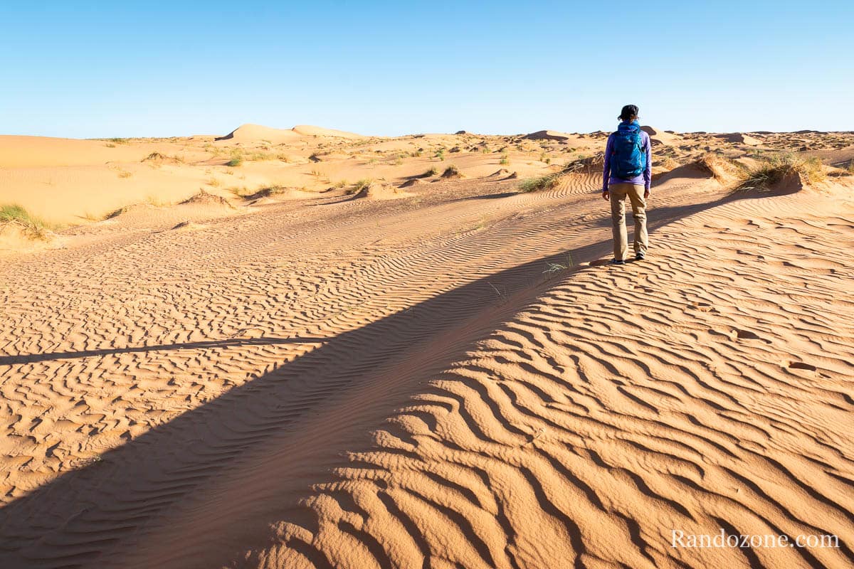 Nous sommes montés sur la dune pour prendre le lever du soleil en photo et le groupe nous rejoint avec Salem notre guide. Pas de vent, un ciel tout bleu et une lumière superbe. La marche peut commencer.