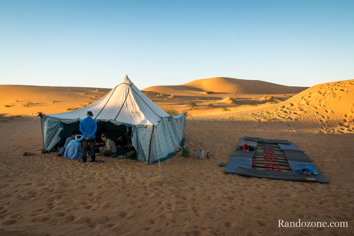A 15h nous reprenons la marche pour 1h30 sous un soleil de plomb. Après avoir grimpé sur une dernière dune notre campement apparait en contrebas. Comme les autres jours nous montons notre tente et dégustons avec le groupe un thé fumant.