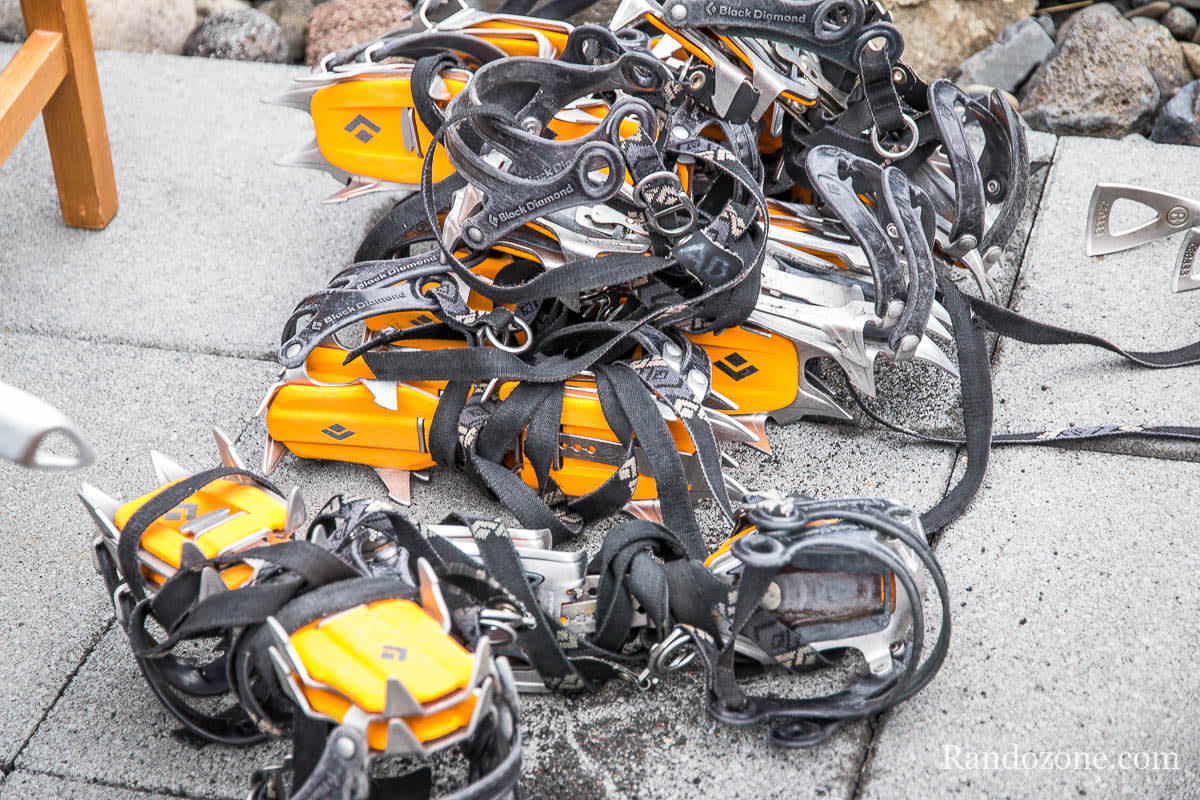 Après la présentation, on nous donne le matériel qui sera nécessaire pour la journée : de quoi manger à midi, un harnais, des crampons et un piolet. On vérifie qu'on a tout le matériel de randonnée (vêtements chauds, sac à dos, chaussures aux pieds et tout le monde est prêt.