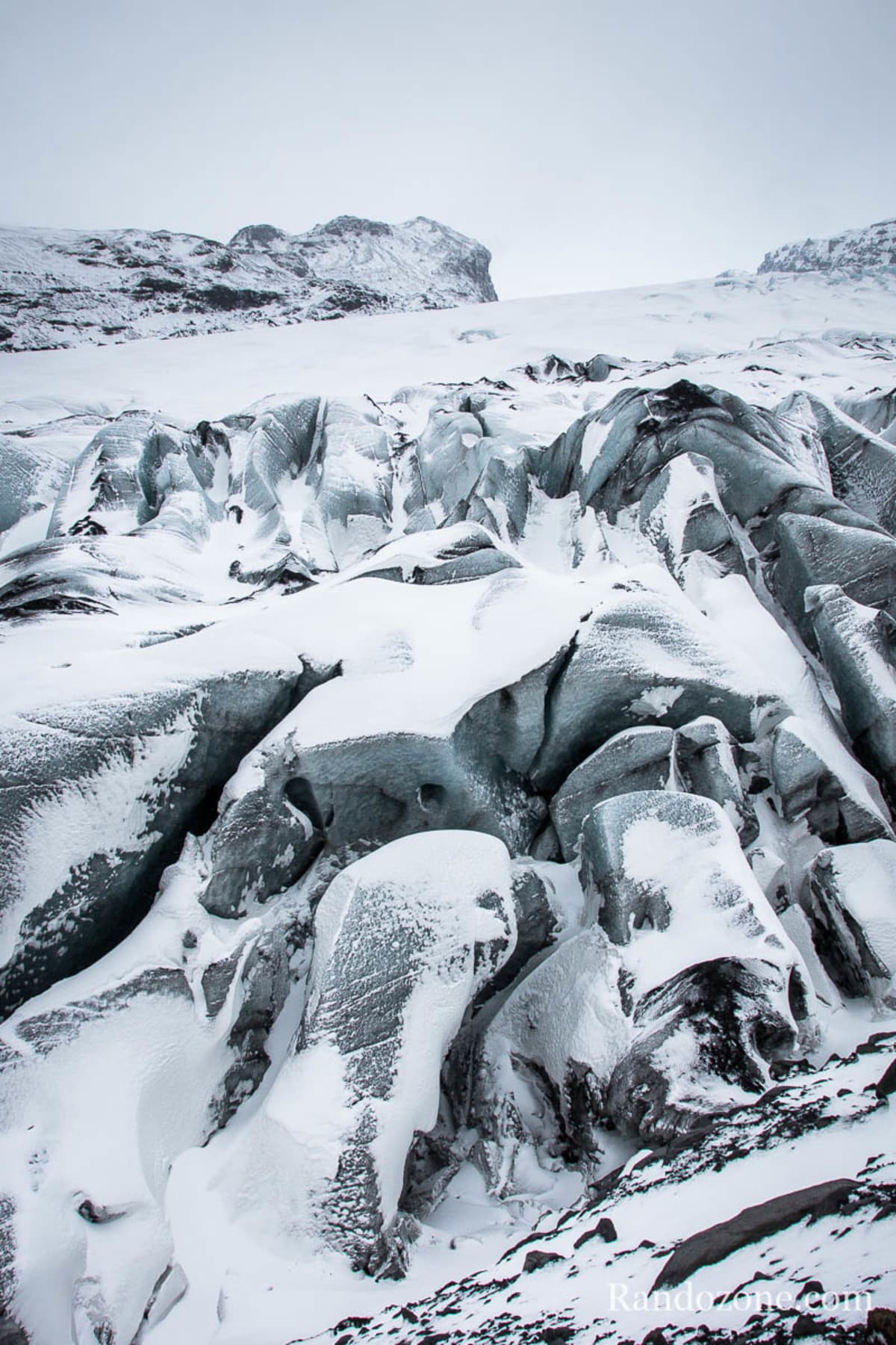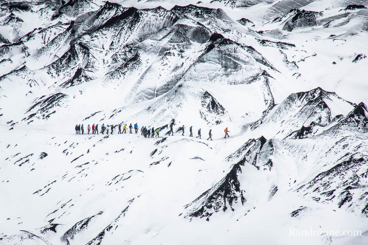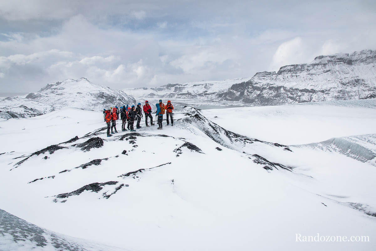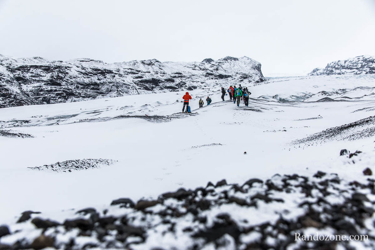 Après avoir bien marché dans la neige, nous commençons à voir la glace s’approcher. Au bout d’un moment les guides nous séparent en deux groupes et nous chaussons les crampons à lanière. Nous mettons les pieds sur le glacier du Sólheimajökull. Le piolet nous ne nous sera pas vraiment utile car nous marcherons sur du plat. Pour ne pas qu’il me gène pour prendre des photos, je l’ai attaché sur mon sac à dos.