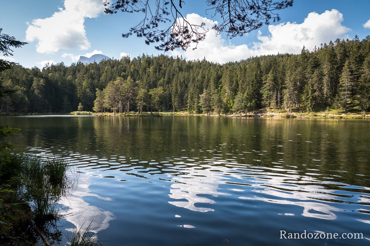 Finalement j'atteins le lac de Mösern - Möserer See en 1h20, ce qui me laisse le temps d'en faire le tour en prenant mon temps et en faisant une petite pause pour profiter de la balade. Il y a beaucoup de monde qui profite de la plage et qui se baignent dans le lac. Sur le site de l'office de tourisme, il est indiqué que c'est l'un des lacs les plus chauds du Tyrol et il se trouve au sein du paysage du haut plateau de Seefeld. Effectivement, on est vraiment pas loin du centre ville. Et bien sûr il est accessible tout au long de l'année puisque le parcours est préparé pour les skis de fond en hiver.