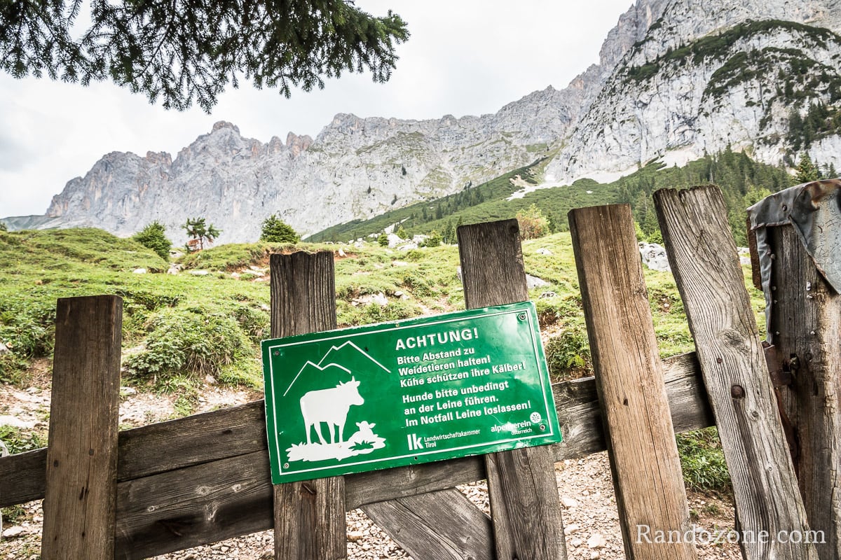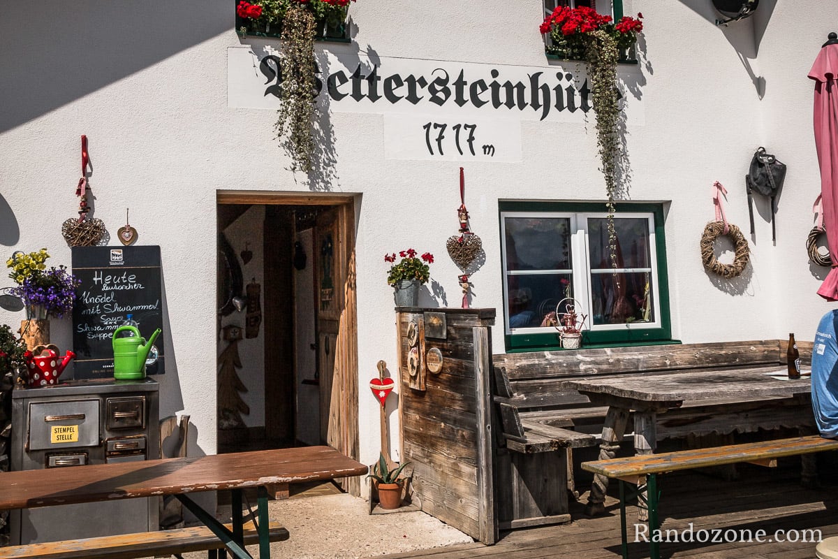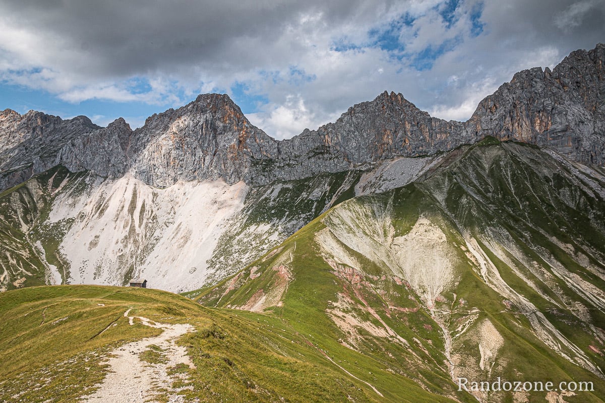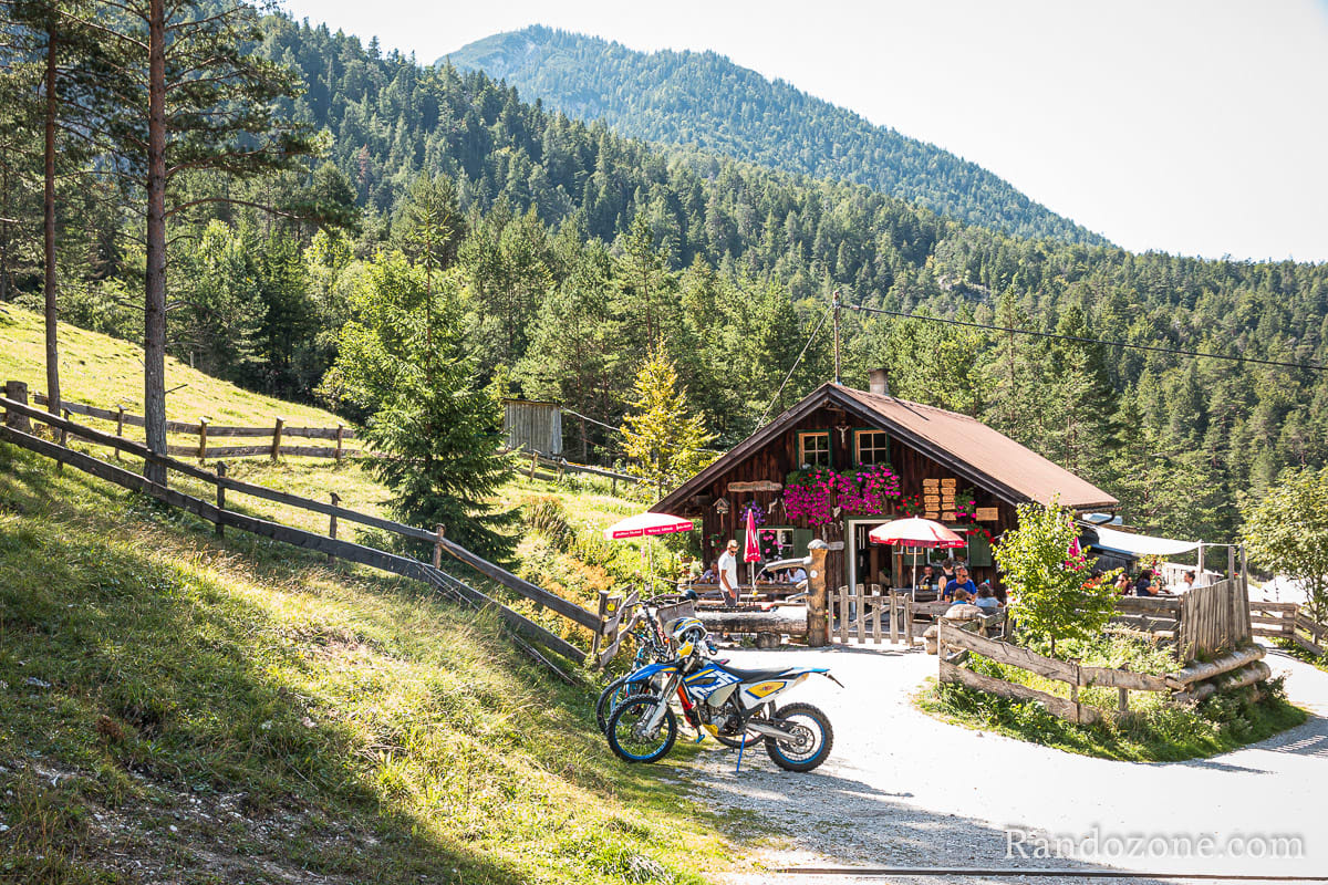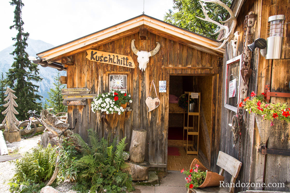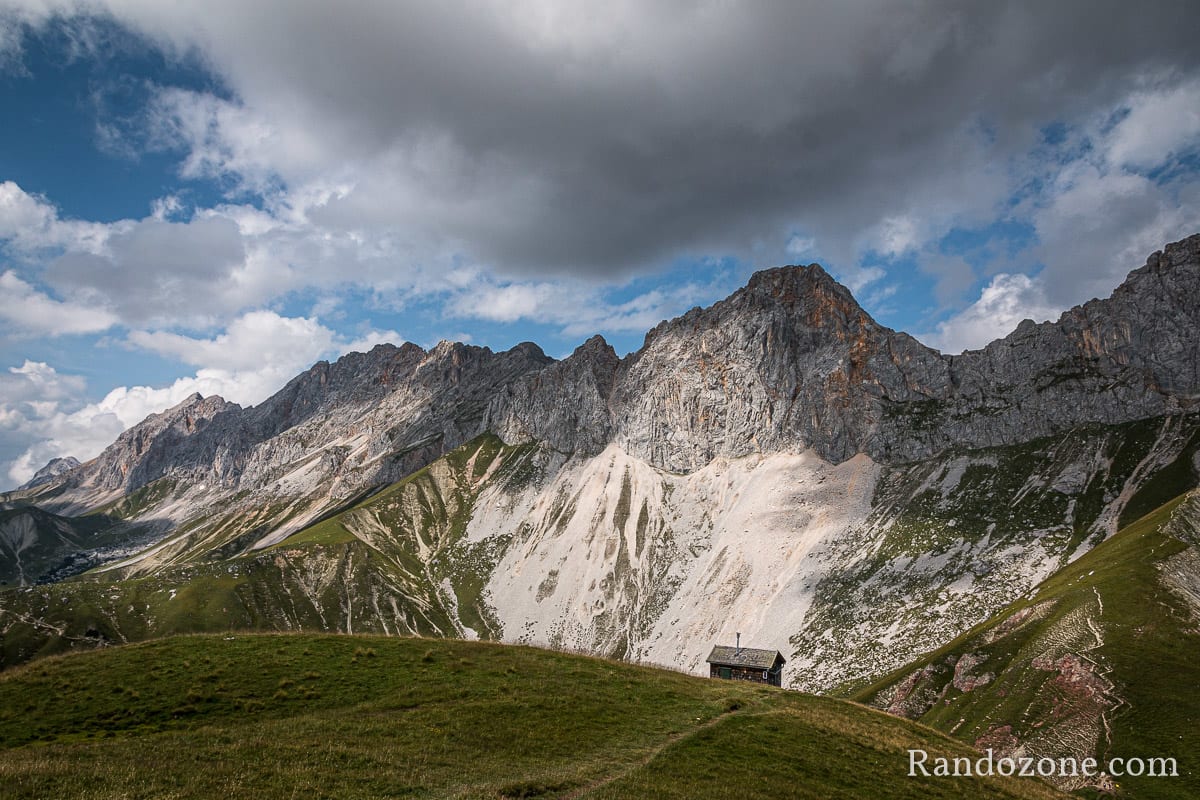 La descente est facile et à partir de maintenant toute la randonnée se fait en descente. Je repasse à la cabane en bois au dessus du col. Avec le soleil et quelques nuages dans le ciel, la cabane est encore plus belle. Au col, au lieu revenir sur le sentier du matin, je prend à gauche pour descendre vers deux refuges. La descente est facile et je rejoins rapidement le second refuge, le Wettersteinhütte, où je vais manger un morceau.
