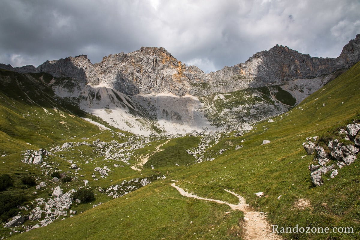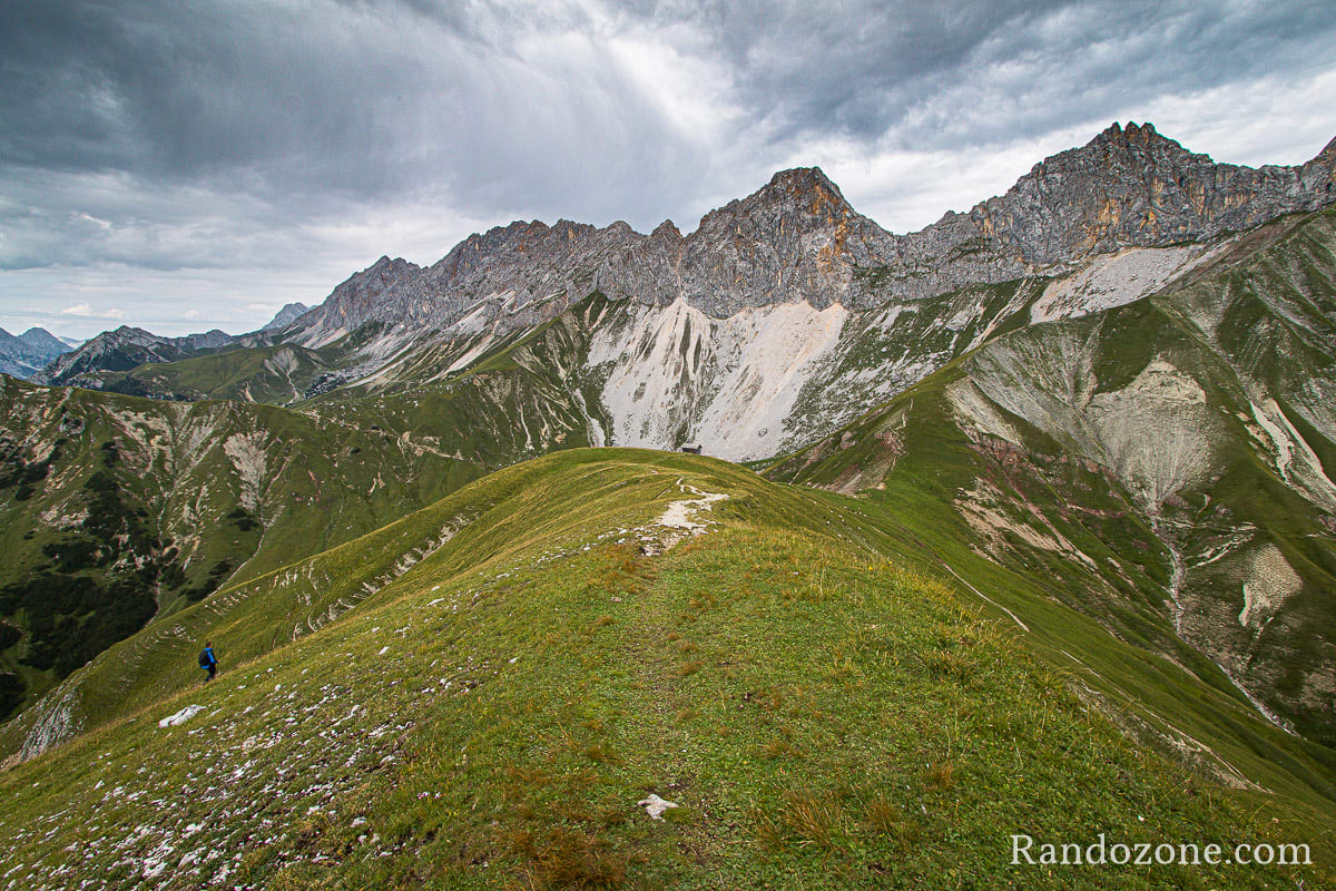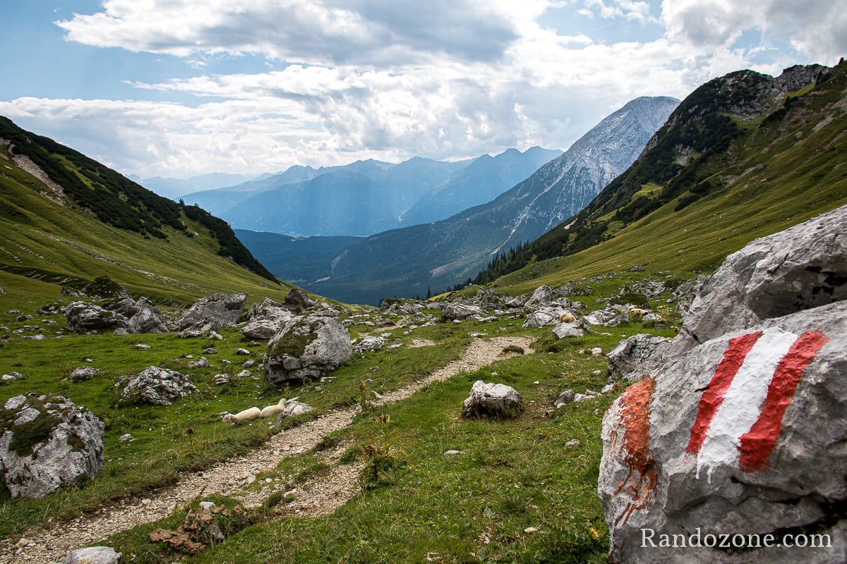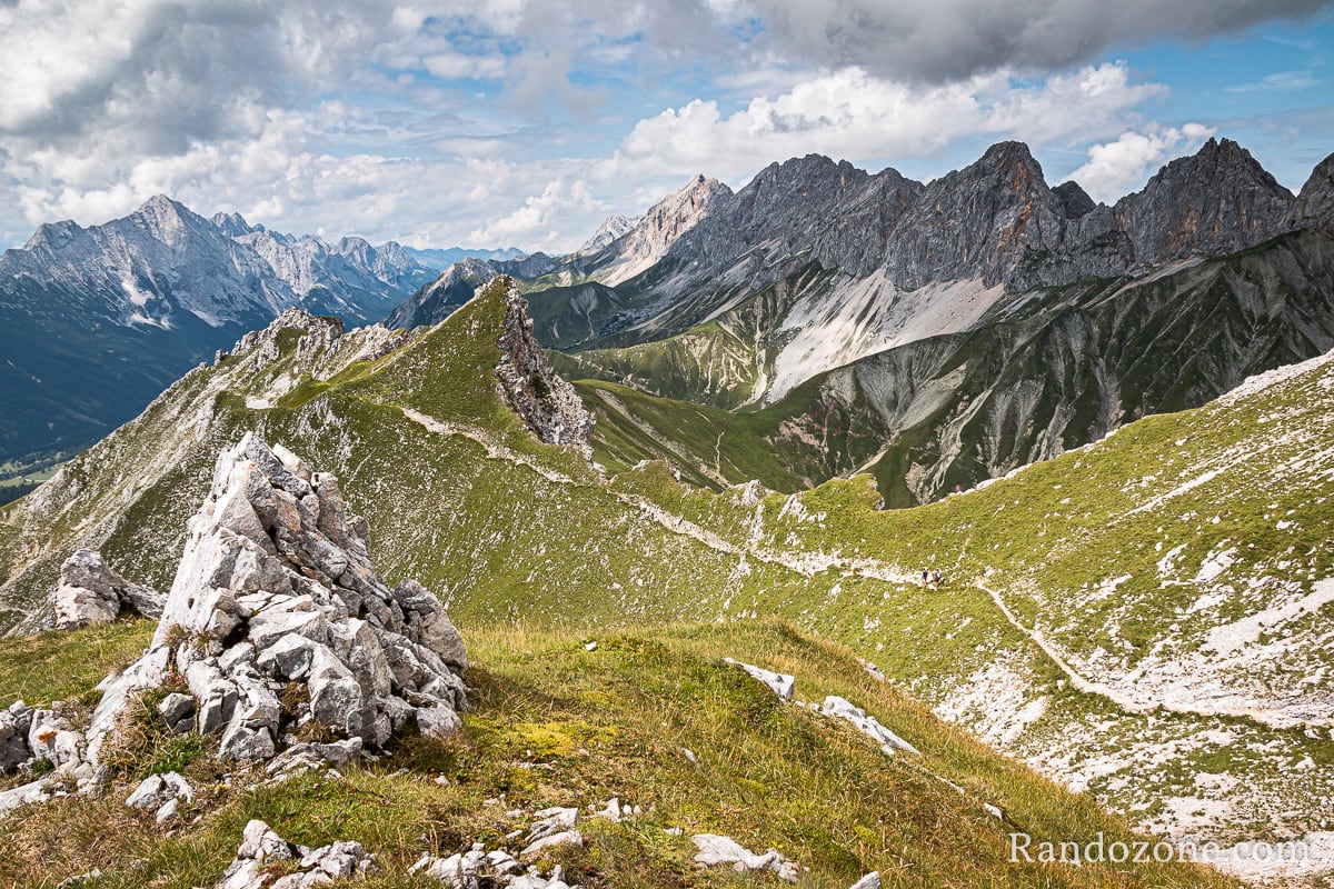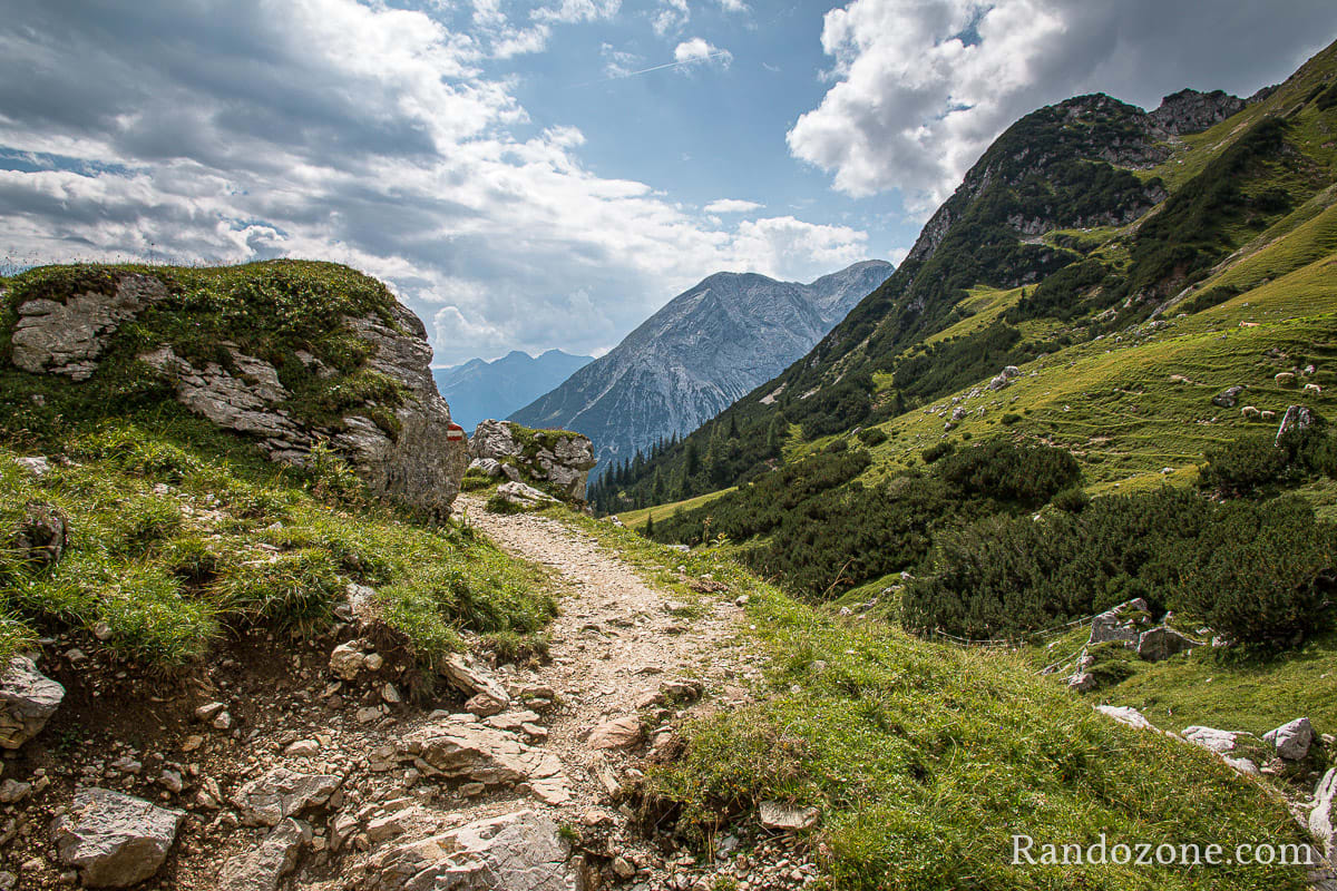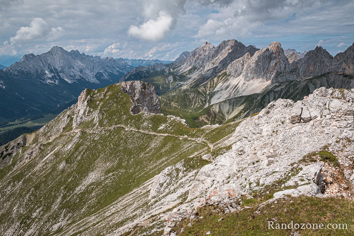Après la cabane, je marche un moment sur la crête. C'est vraiment sympa, je vois les vallées des deux côtés. Sur ma gauche la vallée dont je viens et sur ma droite la vallée avec Seefeld au loin. Un peu plus loin, je me retrouve avec la paroie à gauche et le vide à droite. Le sentier devient un peu plus aérien et il fait faire attention par endroit car c'est vraiment à flanc. Si les roches sont mouillées il faudra faire très attention ou même faire demi tour.