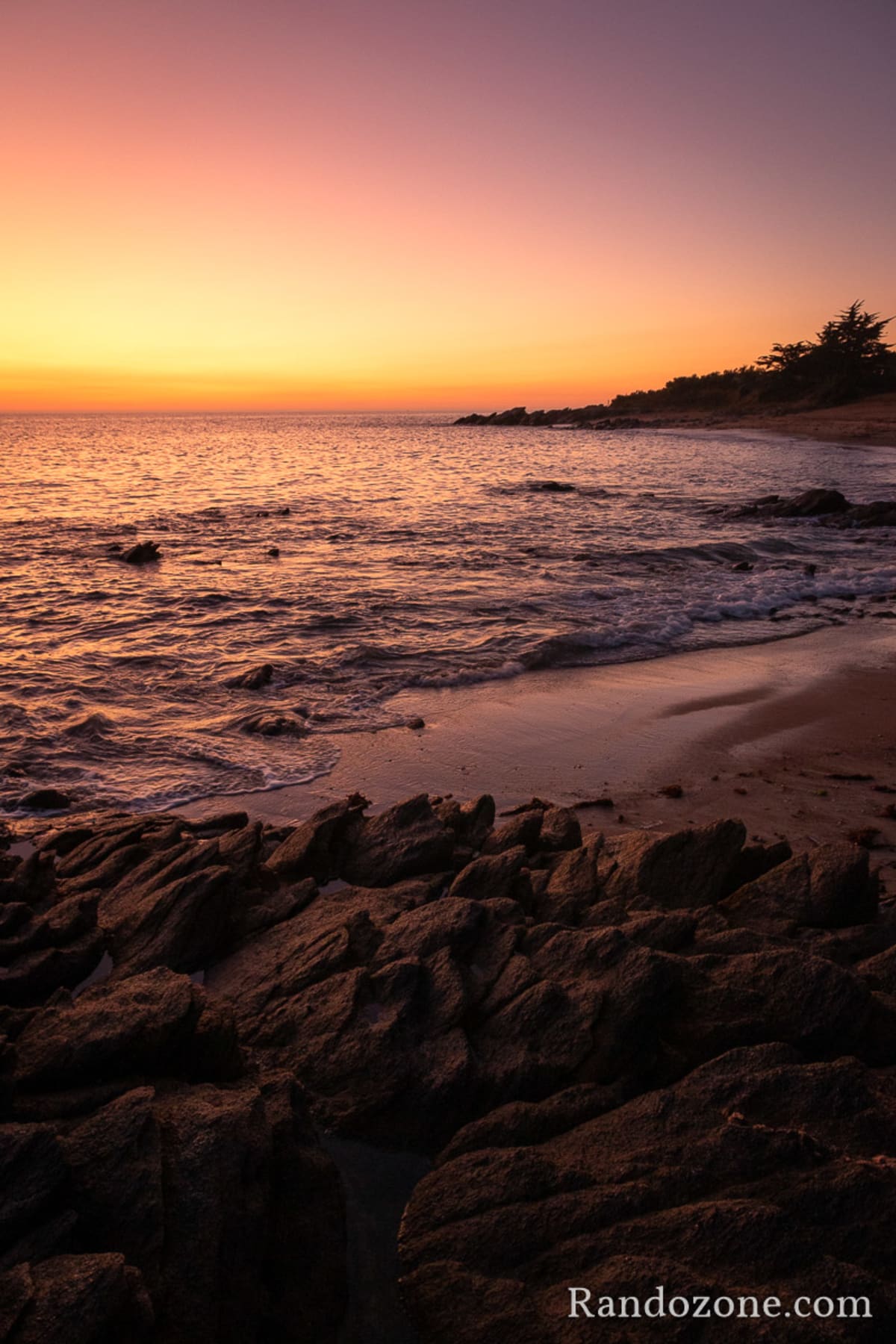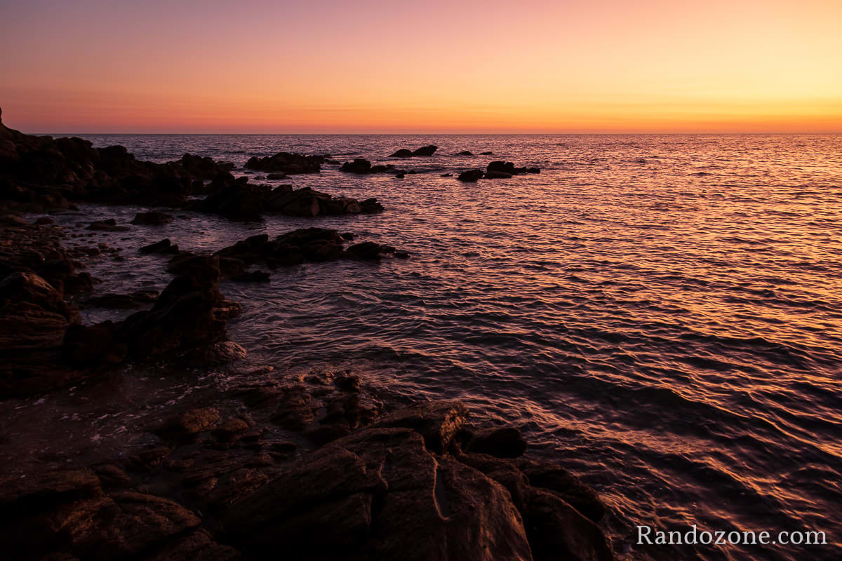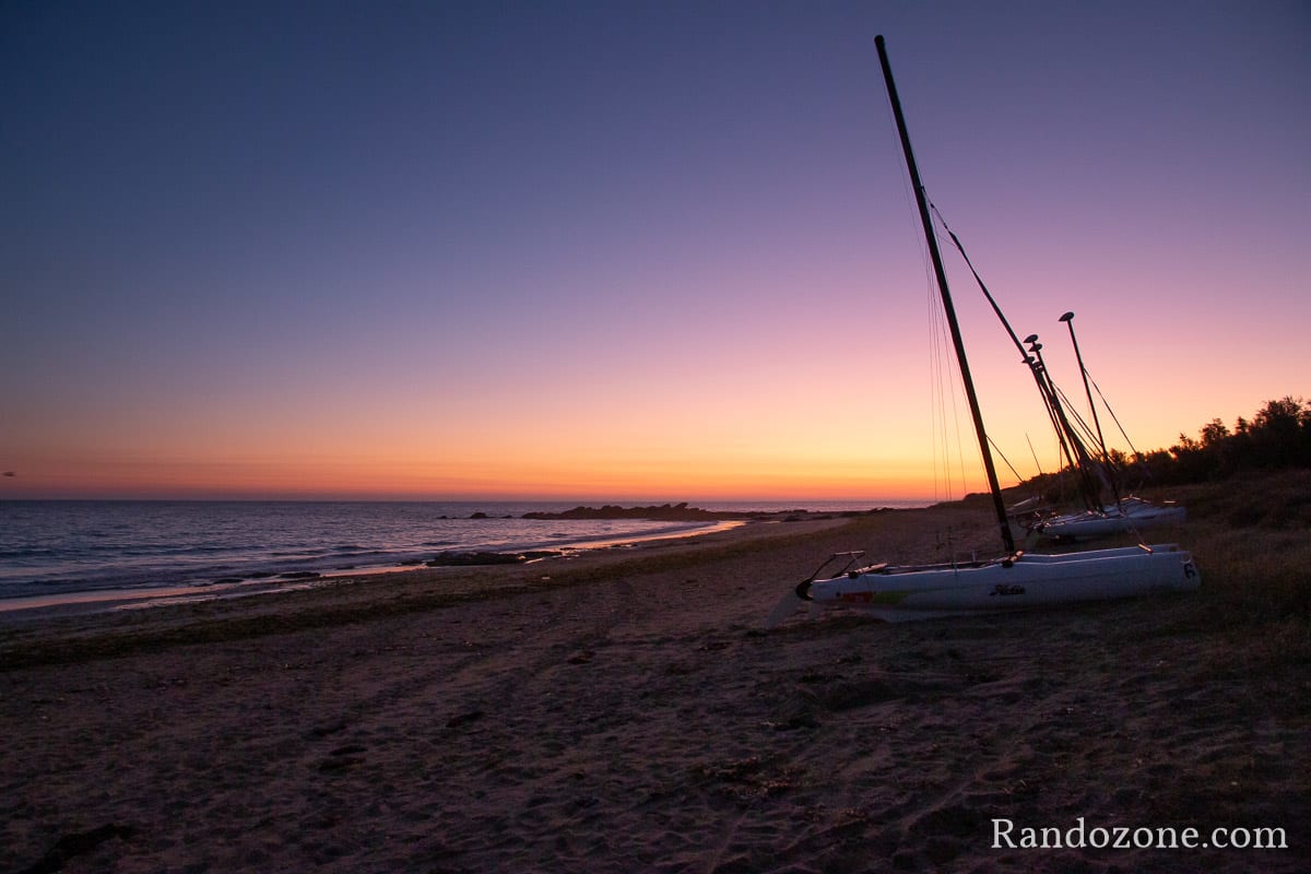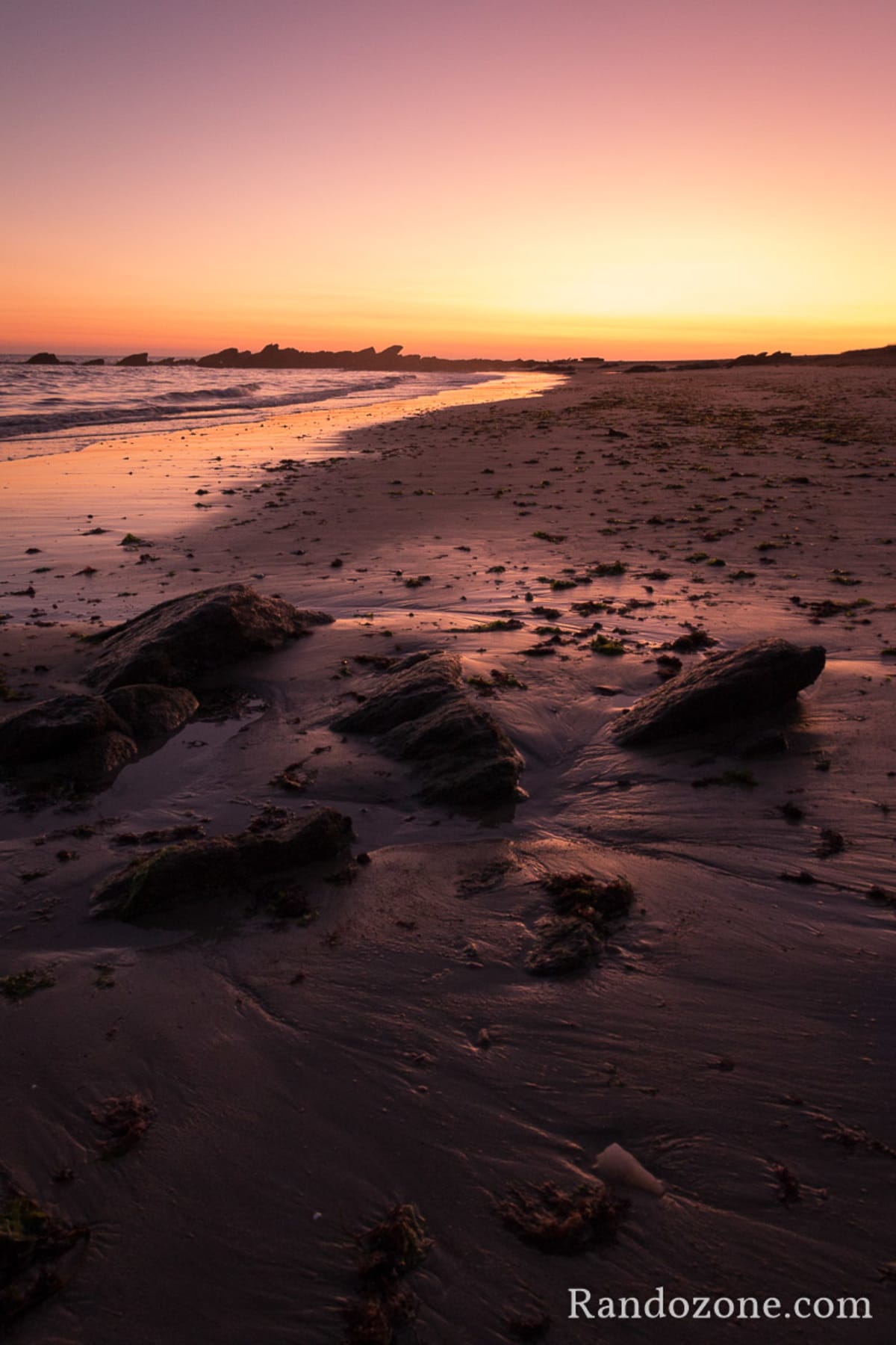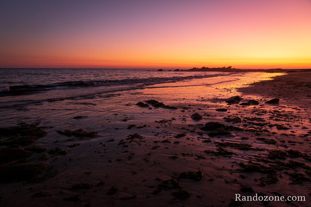 Le matin, je me lève un peu avant les autres pour aller faire quelques photos sur la plage. Il n'y a pas un nuage et le lever du soleil est superbe avec des couleurs fantastiques. ll fait assez frais mais la journée promet d'être très agréable (et je suis quand même en short et tee-shirt donc c'est raisonnable).