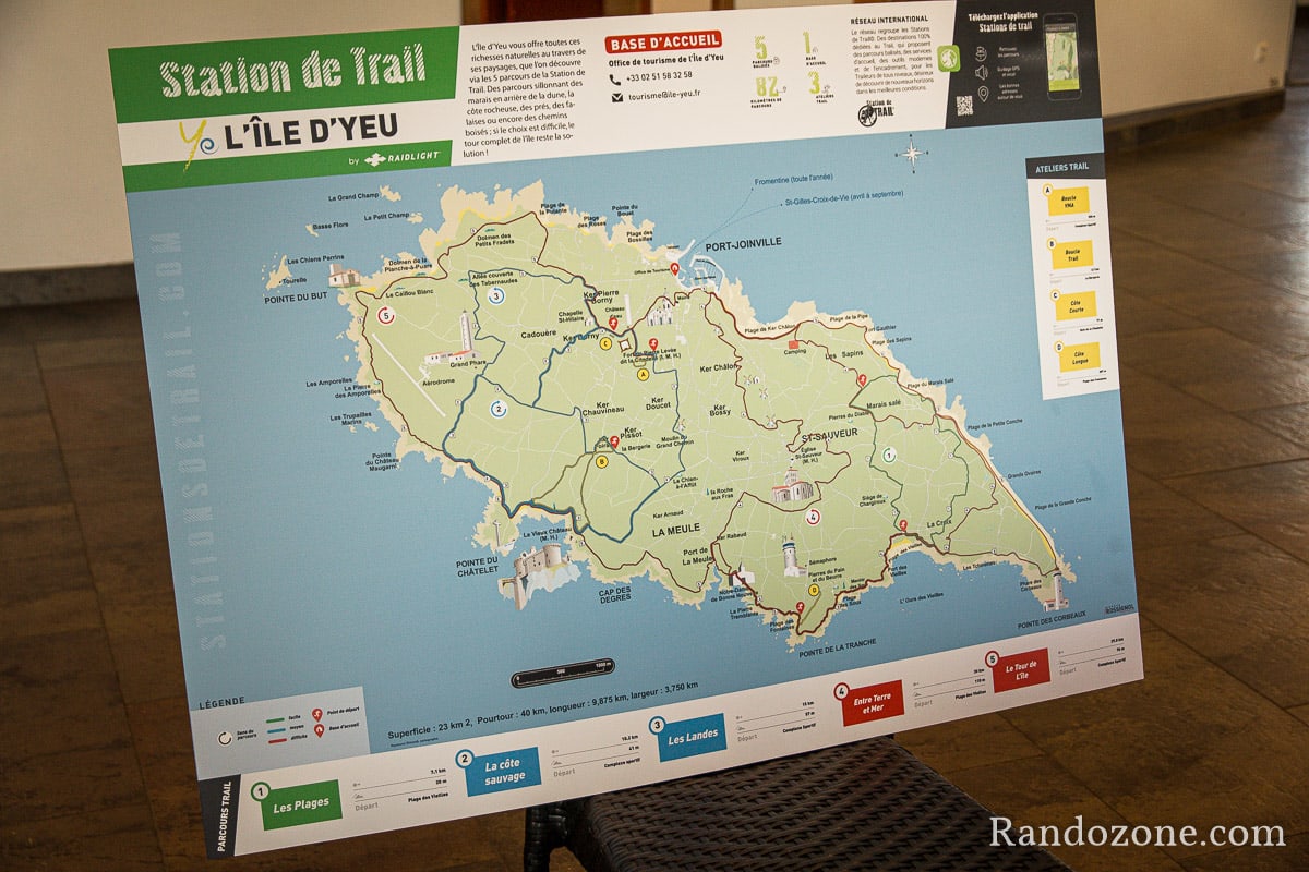 L'île d'Yeu accueille 5 parcours randos-trail de différents niveaux et difficultés. Il y a 1 circuit vert, 2 circuit bleus et 2 circuit rouges. Elle propose aussi 4 ateliers pour améliorer vos capacités physiques et techniques : une boucle VMA, une boucle trail, une côte courte et une côte longue.