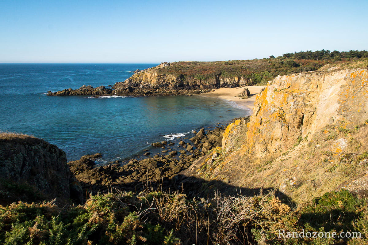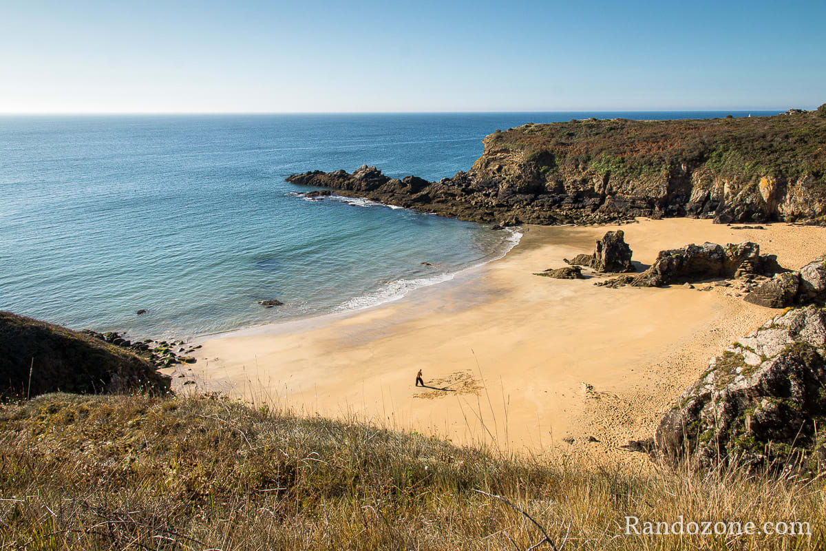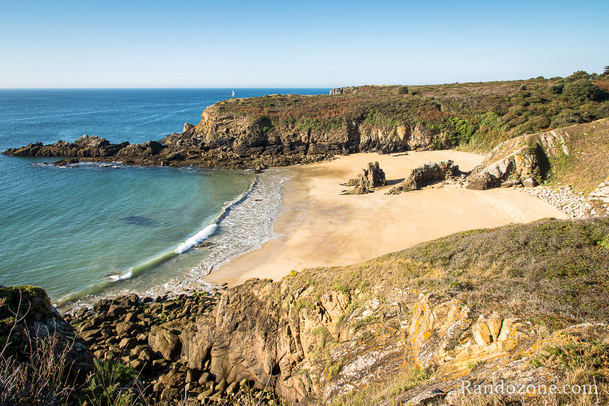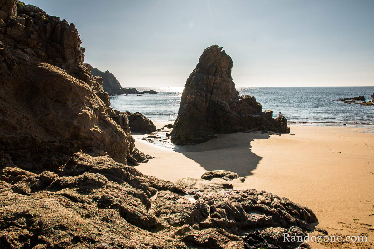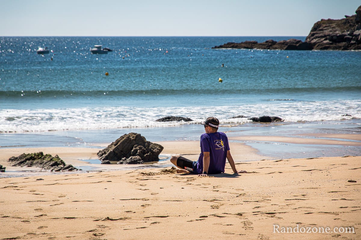 Ensuite le sentier continue de longer la mer pour arriver à la magnifique plage des Soux. Nous arrivons par en haut et le panorama est superbe. Nous descendons à la plage pour une nouvelle petite pause. On en profite pour se tremper les pieds avant de reprendre la randonnée.