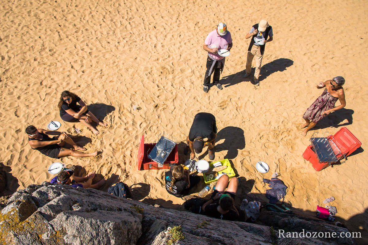 La fin de notre randonnée nous ramène à la plage des Vieilles où nous attend notre repas préparé et apporté par le propriétaire de l'école de voile dans laquelle nous avons passé la nuit. Toujours aussi sympa, il a préparé des seiches avec du riz (un délice) et une tarte aux pommes. Trop sympa de manger ça directement sur la plage.