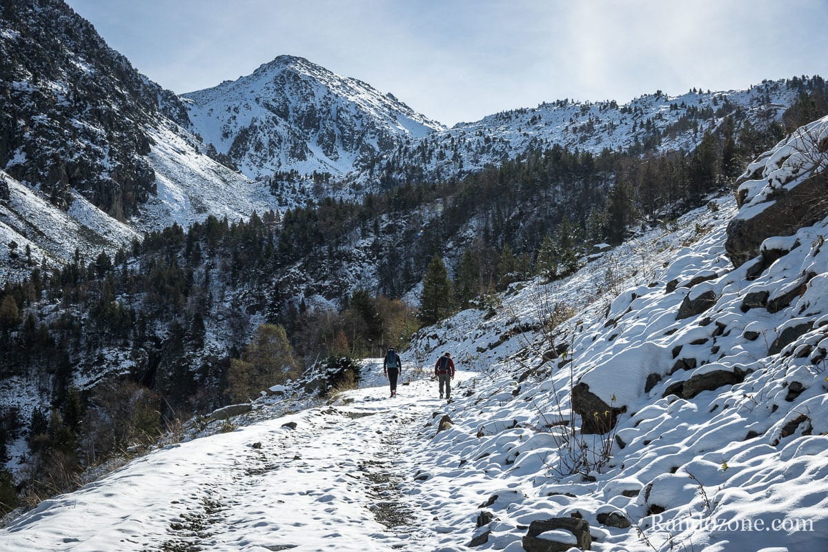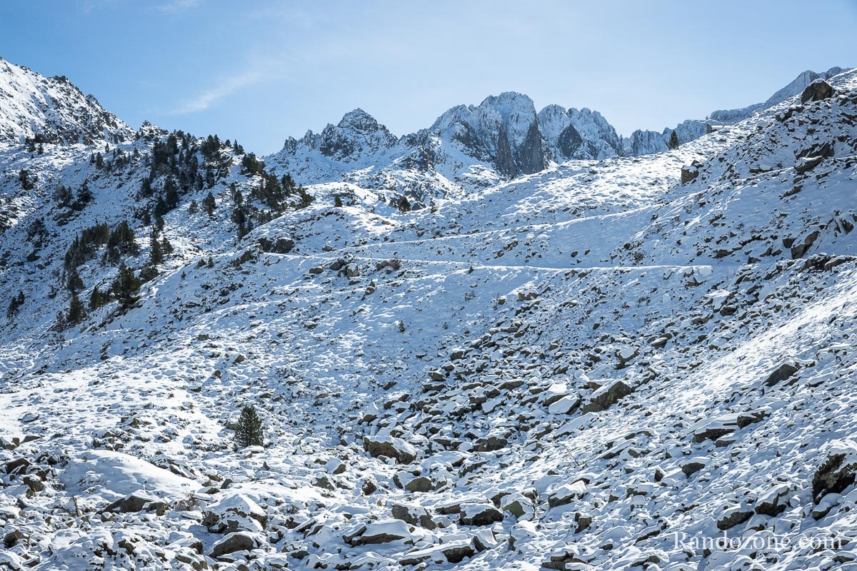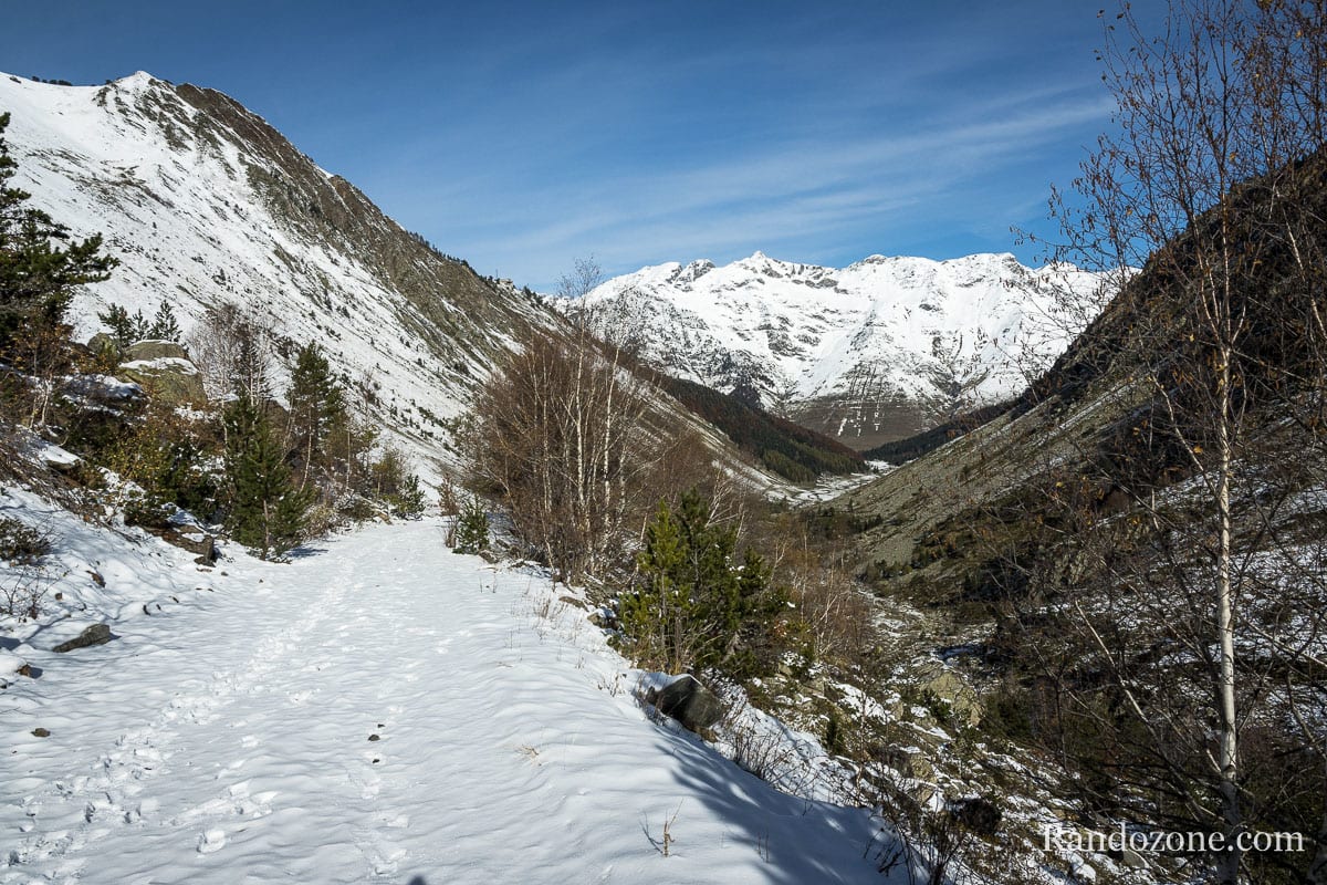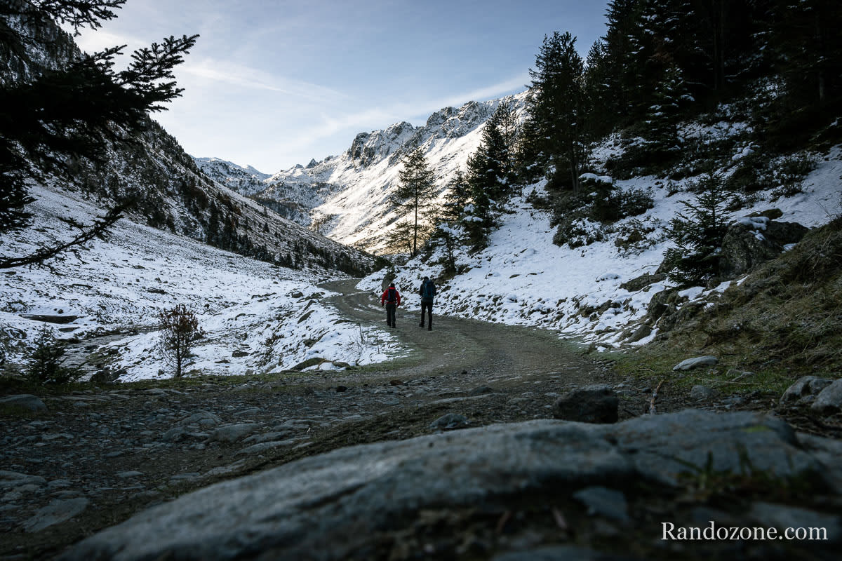 Il y a un peu de neige dès le début de la randonnée mais une fois sur la piste, la neige avait bien fondu car le début de l'itinéraire est bien exposé au soleil surtout dans l'après midi et il avait fait beau le vendredi. C'est donc lorsqu'on commence la montée qu'on commence à marcher dans la neige. Mais rien de bien méchant il n'y a que quelques centimètres et quand on est à l'ombre, la neige est resté froide et fine. C'est plutôt sympa.