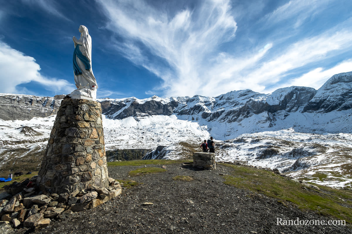 On fait une grande boucle qui ne va pas jusqu'au lac mais qui reste en hauteur pour ensuite se rendre au pied de la Vierge de Troumouse. Il y a un peu de monde dans le cirque et on mange assis au pied de la statue. On profite de la chaleur du soleil et de la beauté des lieux. En plus, le ciel un peu voilé quand on est arrivé se dégage complèment et c'est sous un beau soleil qu'on continue un peu à marcher après manger avant de retourner à la voiture.