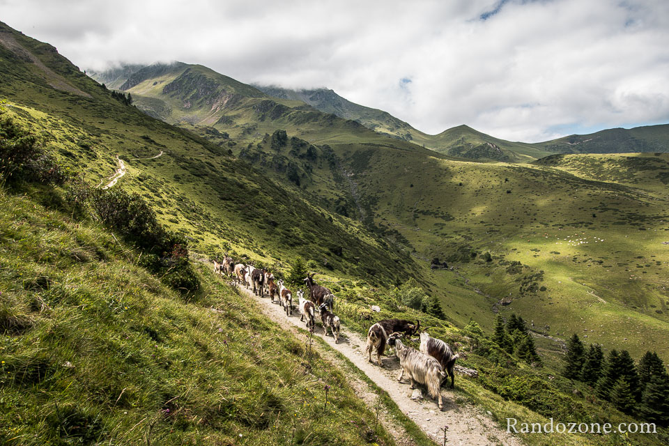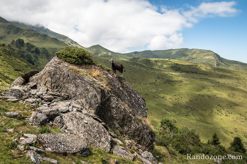 Sur la droite on a une très jolie vue sur la vallée et les sommets alentours. Et sur notre gauche un troupeau de chèvres adorables nous regarde passer sans grand intérêt.